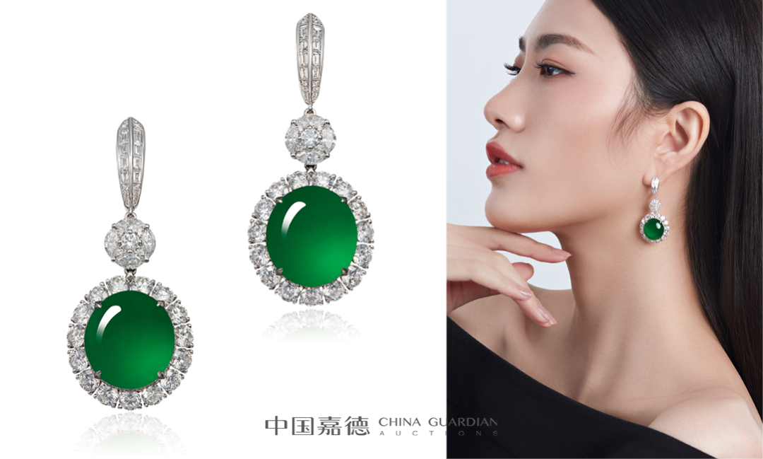 天然翡翠内部晶体的结构,决定了它的“种水”。可称之为“玻璃种”的翡翠极为稀少,晶体必须清透,细腻致密,光可以无阻挡的穿透它。绿色分布均匀、色泽纯正艳丽,方为上乘佳品。Lot5472 这对耳环,翡翠采于同一原料石材,色泽气韵完美相衬,十分难得。蛋面饱满,颜色满绿,浓艳纯正,分布均匀;晶体内部瑕疵甚少无可挑剔。镶工亦大气考究,佩戴效果尊贵典雅,是不可多得的佳品。