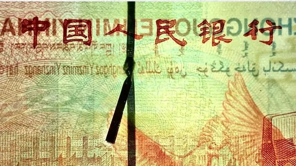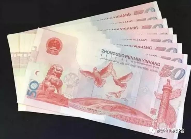 建国五十周年纪念钞印制过程中占有了几个第一:我国第一张纪念钞;第一次使用开窗安全线;第一次使用调色的钞纸(色调偏黄,以往都是白色的纸张);