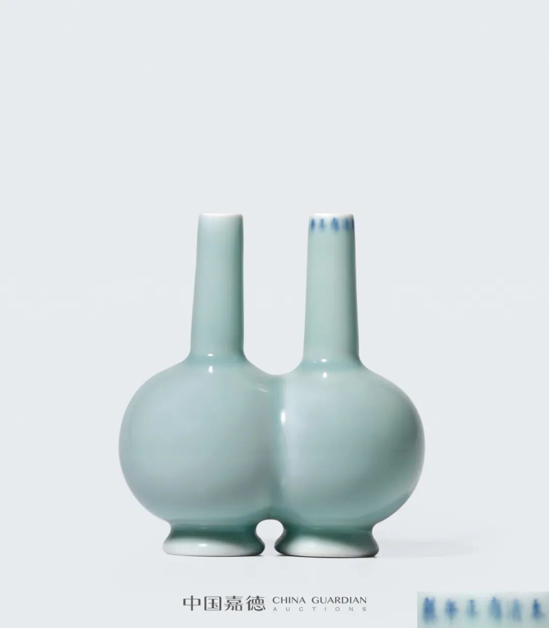 双联瓶由两只小长颈瓶融合而成,仅腹部相连,口、颈、底、足皆各自独立。耿宝昌先生《明清瓷器鉴定》中提及,”四联瓶,器身由四个相同小筒粘连一体,也有两瓶粘连的”。此类多联造型,为雍正新创器型,颇具巧思。虽然是将单个器型拼合而成,但相互融合的程度,均要经过反复试验,才能得出最佳的审美呈现,凸现御窑制瓷之功。