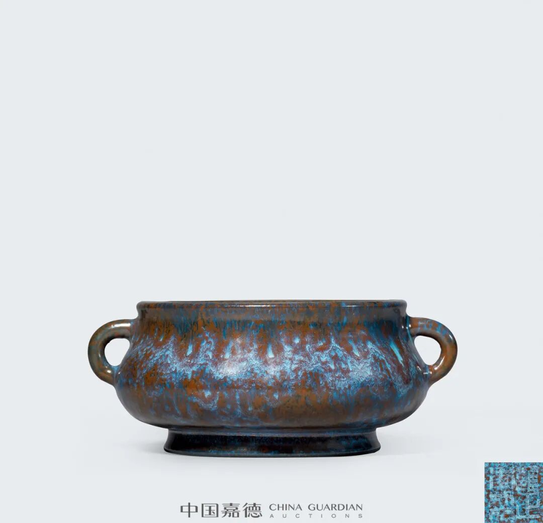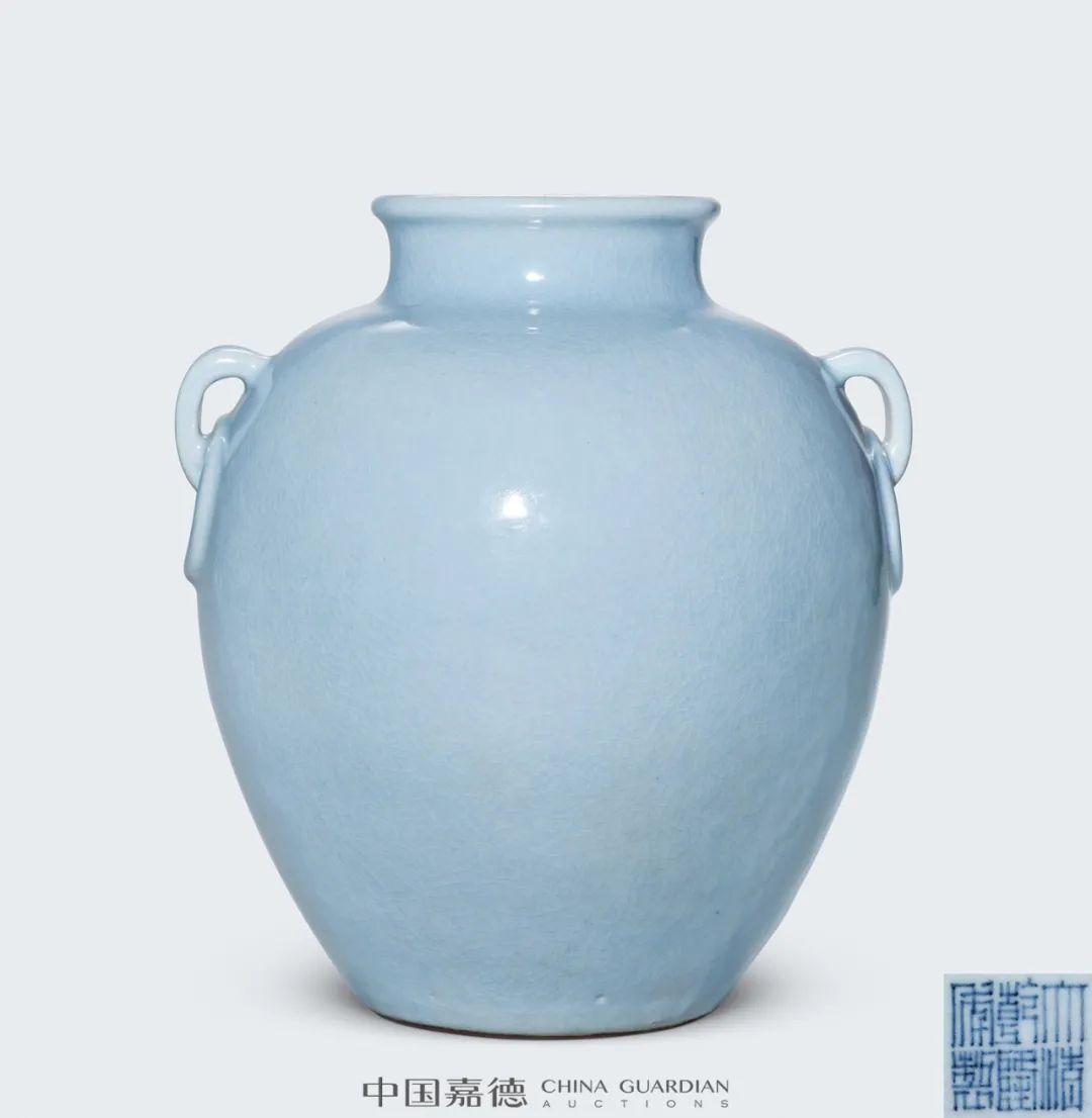 本品肩部安贴拱形双耳,丰富造型之美,釉施其上随之起伏,并于凸起处露出淡淡的胎骨之色,颇见苍雅古朴之美,穆穆透出赵宋旧物之意韵。远观之下,古气盎然,扑人眉宇,予人以无限恬静之雅意。Lot3293