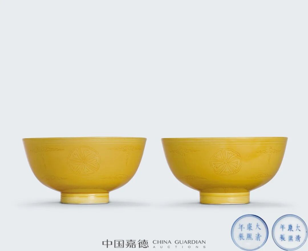 纽约收藏家 Emily B. Treror 旧藏;佛罗里达州北棕榈滩收藏家 John B. Treror. Jr. 旧藏;纽约拍卖会,2007年9月19日,lot 352;伦敦拍卖会,2012年11月7日,lot 250;本品书款方式被认为是康熙晚期的安窑作品,督陶者安尚义,为明珠家臣。一说安窑制瓷经费并非出自朝廷,但所见制品皆精,为时人称道。景德镇陶瓷馆藏有与本品相类的清康熙黄釉暗刻团花纹小碗,书款为”大清康熙年制”六字双行楷书款,为康熙常见的御窑书款方式,二者对读,对于研究安窑作品与传统康熙御窑作品之间的关系,具有极高的研究价值,值得珍视。