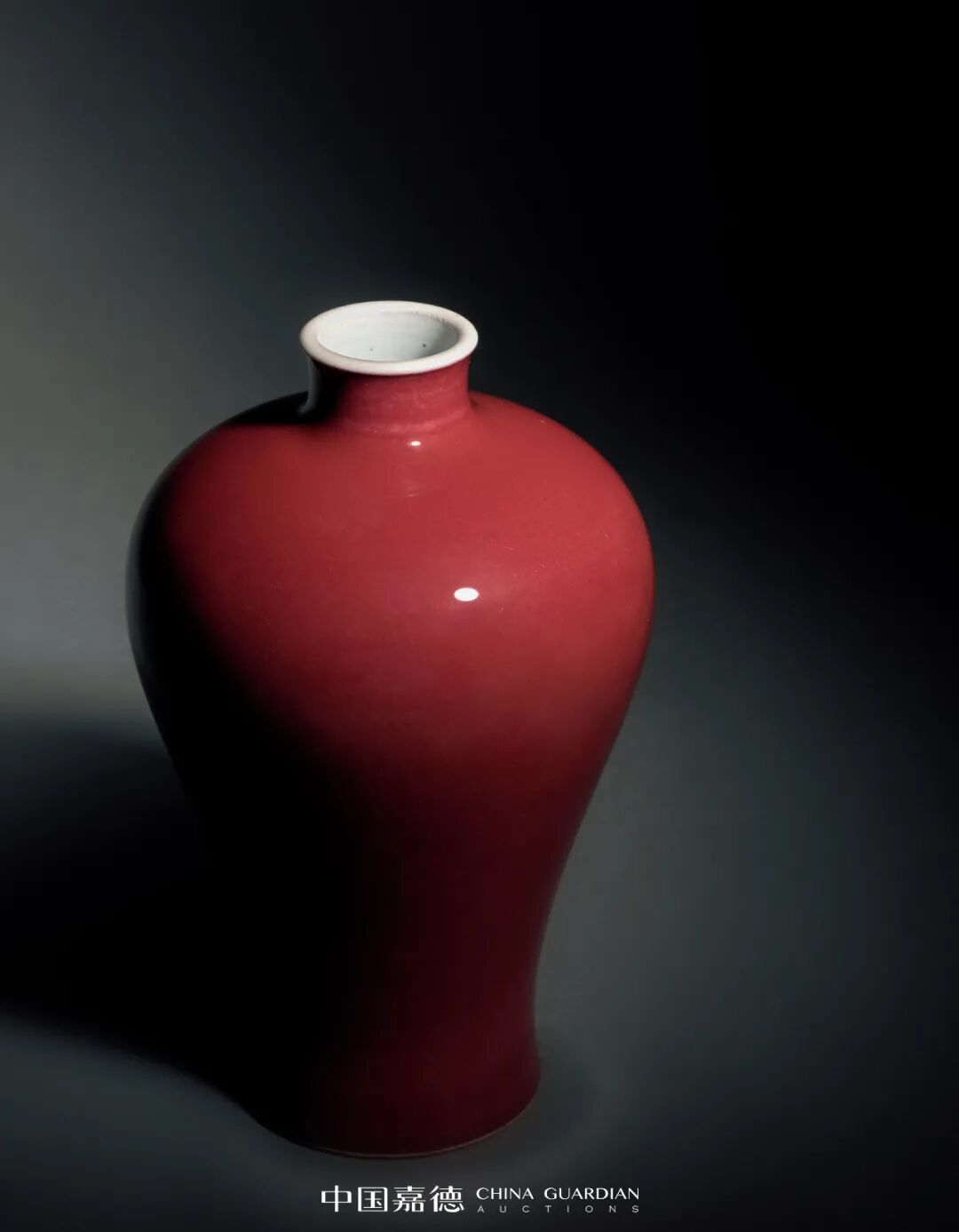 瓶器形挺拔俊秀,线条柔美起伏,尽见迤逦之姿。瓶周身施浓艳之红釉,口内施凝润之白釉,釉质光亮,釉色均匀,对比强烈。红釉宛如初凝之牛血,颇具宣德遗韵。