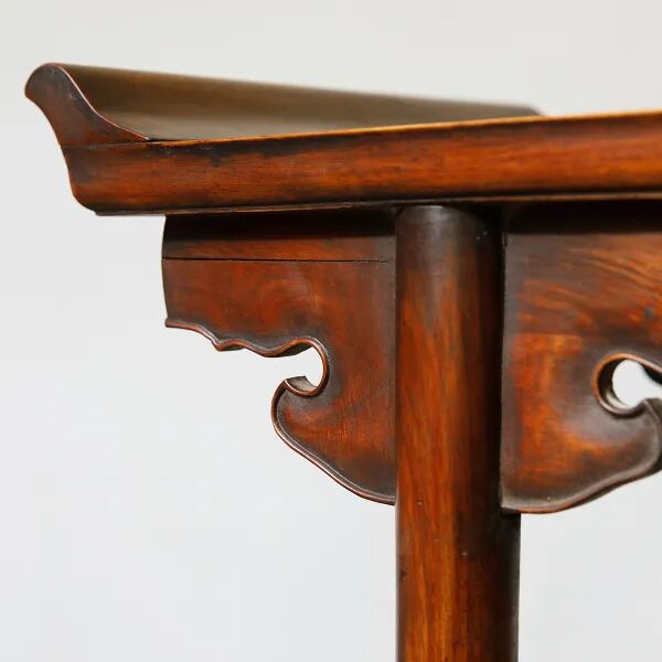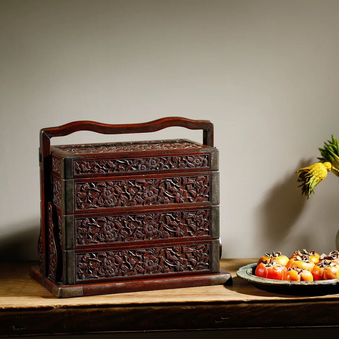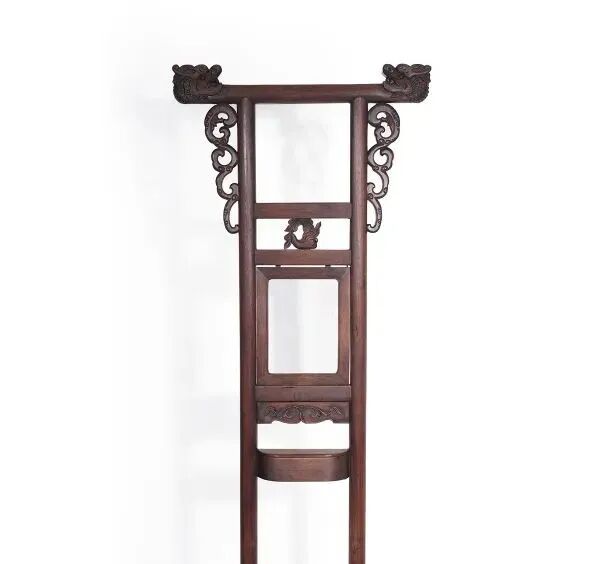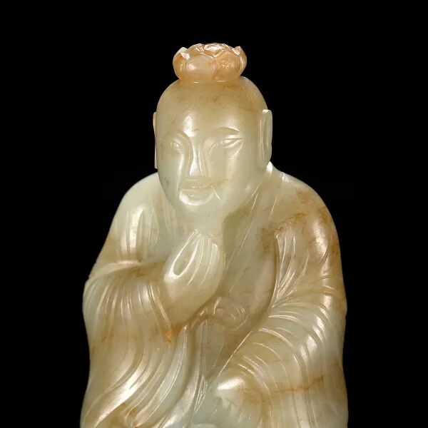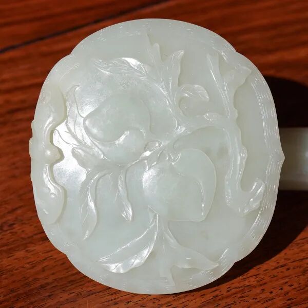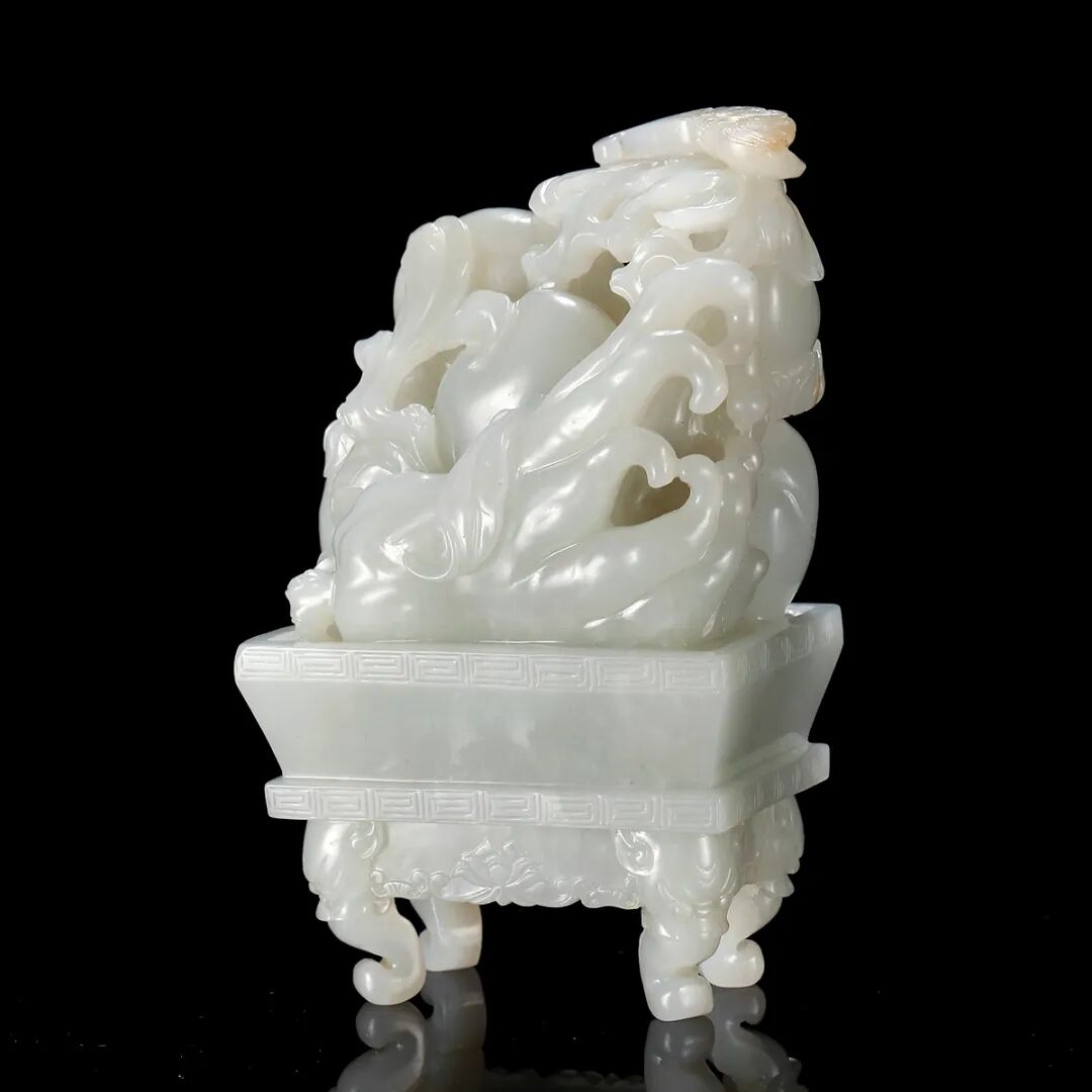 说明:千百年来寿桃、佛手等一直具有吉祥寓意,受到人们的喜爱和珍视,是中华吉祥文化的代表象征。宫廷中,更将其作为各种艺术品的创作主题,无论是瓷器中瓶、盘、碗等,亦或漆器中的桃形盒,佛手摆件,还是有如本品的白玉福寿摆件,都可在紫禁城或作为行宫的颐和园殿堂陈设中觅其芳踪。摆件以整块白玉和田籽料随形整雕而成,玉色纯白,温润细腻。形制特殊,底下饰成供盆,上下口沿起回纹一周,四兽面纹三弯腿,中间装饰阴刻花卉纹牙条,类家具做法,供盆里雕刻佛手、灵芝、寿桃等蕴意祥瑞的果实,构图饱满,层次丰富,繁而不乱,可见功力非同一般。玉清供摆件量材制器,随形施艺,缜密布局,以自然之质再造自然,兼顾质、形、艺,彰显皇家之气。说明:木雕坐像,外部髹漆以大面积剥落,露出原木纹理,沧桑古朴。圆雕达摩禅定坐像,达摩盘腿而坐,身着长袍,衣纹飘逸流畅,衣袍自然下垂,浓眉隆鼻,双眼圆睁,双手隐藏于衣袖之中。将达摩坐姿平稳自然,将禅定时的状态刻画的栩栩如生,神态庄祥静穆,令人油然而生一种肃穆之感。说明:此盒取黄花梨为材,精制而成,长方体。提盒设计源自食格类器物,共设有三层分盒,榫卯结构,格角之处皆用铜叶。罗锅提梁两端连立柱,下接托底。常见提盒多素面,此件不落窠臼,盖面、每层侧边、立柱皆减地浮雕缠枝花卉纹,纹理清晰流畅,线条连绵卷曲,精美异常。色泽褐红如枣,包浆莹润,折射出久经岁月洗涤的古旧美感。加之雕刻工艺精湛,设计巧妙,清雅秀丽,实为佳器。说明:此件水盂以竹根整挖成型,开口随形。整体似一段树桩,其上瘿节起伏,纹理自然雕出。树桩一周有松树几株,圆雕镂空高浮雕多种技法并用,将松干虬曲折弯之貌展现得淋漓尽致。松叶团团簇簇,或聚或散,大小相迭,姿态多样,各尽其妙。水盂大小适中,形随手合,正适盘玩。水盂原配鸡翅木底座,整体镂空,座面刻花叶交错相迭,表现风格与水盂如出一辙,颇为贴合。两者相合趣味尽出,相得益彰。原配乌木底座。说明:此虫罐选“三河刘”葫芦,侈口束腰,圆腹底。口沿原配镶嵌紫檀,盖中心镶嵌乌木镂空雕山水庭院图景。“三河刘”指的是咸丰年间河北三河县刘显庭所种的葫芦,这些大都在火沙地上种植,厚薄合适,制成虫罐荫皮搭叶、瓷皮糖胎、发音宽厚,深受玩虫者的喜爱。“三河刘”从咸丰年间至今,盛名兴旺,现今所见的许多珍贵藏品都是三河刘所范制。收藏大家王世襄言:“三河刘一律光素,未见亦未闻范有花纹者。自晚清以来,身价最高。”可见,三河刘制作的葫芦,无论在当时还是现代都难得一寻,千金难买。高:86.5cm 长:12.5cm 宽:39.3cm说明:此案以黄花梨木材制成,木质细密坚韧,色泽温润,木香清雅,面心色艳若火焰,纹如水波涌动。造型宏伟典雅,传承了明式家具之简约,婉转的线条和敦实的面板相互衬托,显现出明式家具永恒之美。翘头与案面两端以榫卯拍合,恰盖住两端的纹理,翘头的造型轻轻扬起后又柔和下弯,牙头收成甚为简练的卷云纹,造型含蓄,大气之中可见轻盈。整体造型简练,气势内敛,包浆赭中泛红,甚温润,比例得宜,造型简练,为明式家具之经典制式。