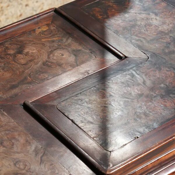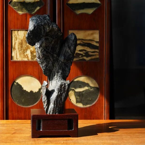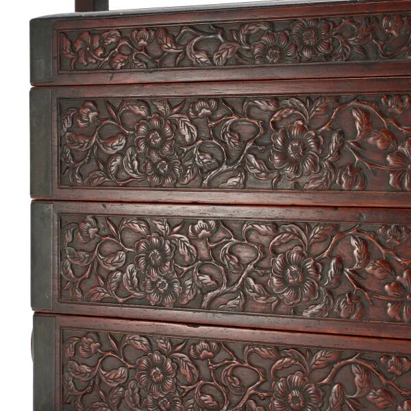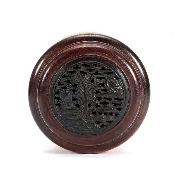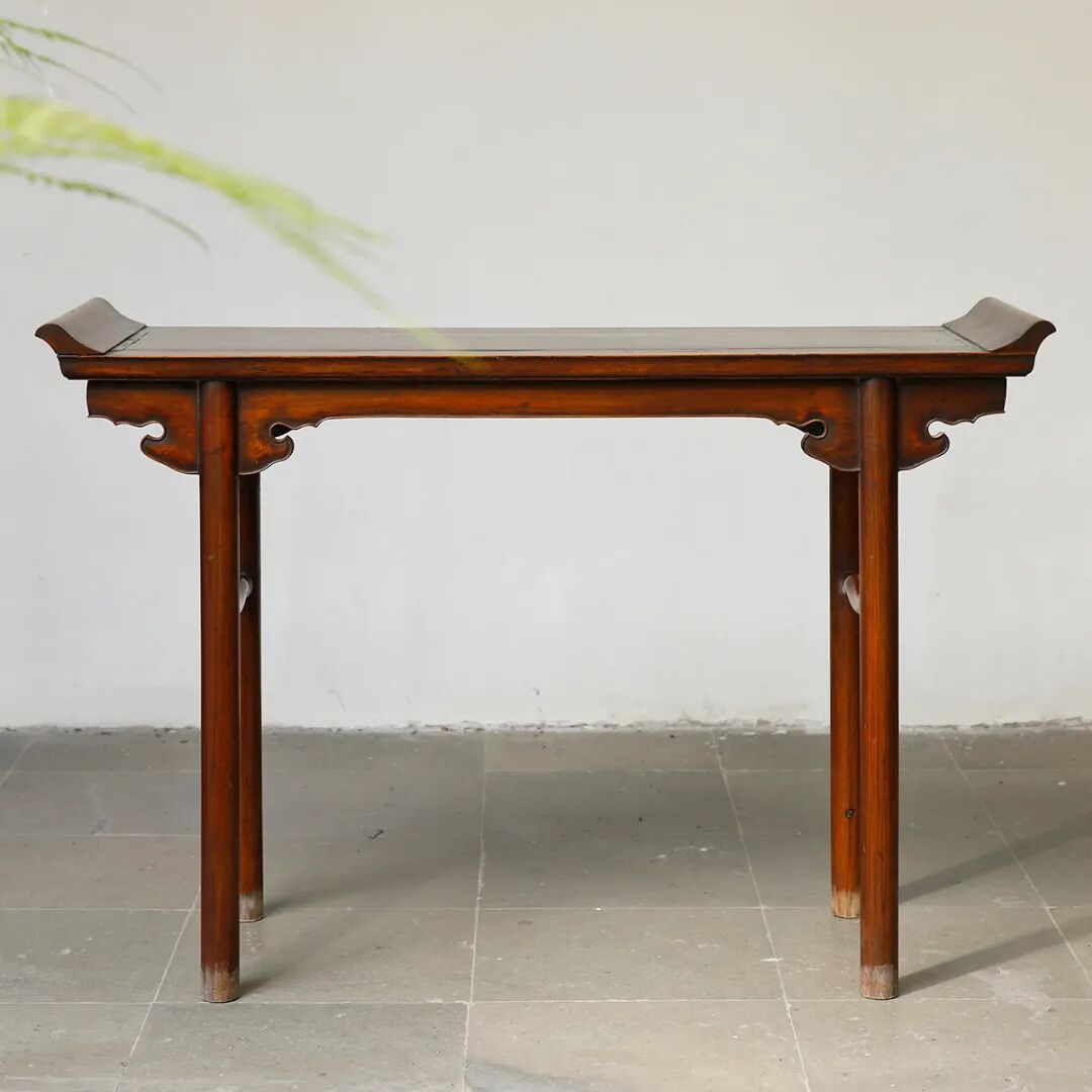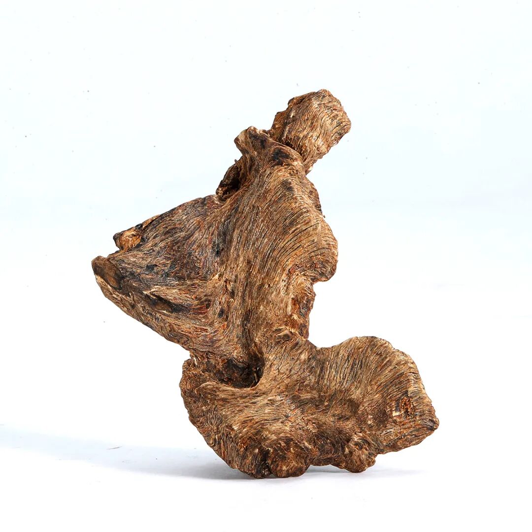 说明:千百年来寿桃、佛手等一直具有吉祥寓意,受到人们的喜爱和珍视,是中华吉祥文化的代表象征。宫廷中,更将其作为各种艺术品的创作主题,无论是瓷器中瓶、盘、碗等,亦或漆器中的桃形盒,佛手摆件,还是有如本品的白玉福寿摆件,都可在紫禁城或作为行宫的颐和园殿堂陈设中觅其芳踪。摆件以整块白玉和田籽料随形整雕而成,玉色纯白,温润细腻。形制特殊,底下饰成供盆,上下口沿起回纹一周,四兽面纹三弯腿,中间装饰阴刻花卉纹牙条,类家具做法,供盆里雕刻佛手、灵芝、寿桃等蕴意祥瑞的果实,构图饱满,层次丰富,繁而不乱,可见功力非同一般。玉清供摆件量材制器,随形施艺,缜密布局,以自然之质再造自然,兼顾质、形、艺,彰显皇家之气。说明:木雕坐像,外部髹漆以大面积剥落,露出原木纹理,沧桑古朴。圆雕达摩禅定坐像,达摩盘腿而坐,身着长袍,衣纹飘逸流畅,衣袍自然下垂,浓眉隆鼻,双眼圆睁,双手隐藏于衣袖之中。将达摩坐姿平稳自然,将禅定时的状态刻画的栩栩如生,神态庄祥静穆,令人油然而生一种肃穆之感。说明:此盒取黄花梨为材,精制而成,长方体。提盒设计源自食格类器物,共设有三层分盒,榫卯结构,格角之处皆用铜叶。罗锅提梁两端连立柱,下接托底。常见提盒多素面,此件不落窠臼,盖面、每层侧边、立柱皆减地浮雕缠枝花卉纹,纹理清晰流畅,线条连绵卷曲,精美异常。色泽褐红如枣,包浆莹润,折射出久经岁月洗涤的古旧美感。加之雕刻工艺精湛,设计巧妙,清雅秀丽,实为佳器。说明:此件水盂以竹根整挖成型,开口随形。整体似一段树桩,其上瘿节起伏,纹理自然雕出。树桩一周有松树几株,圆雕镂空高浮雕多种技法并用,将松干虬曲折弯之貌展现得淋漓尽致。松叶团团簇簇,或聚或散,大小相迭,姿态多样,各尽其妙。水盂大小适中,形随手合,正适盘玩。水盂原配鸡翅木底座,整体镂空,座面刻花叶交错相迭,表现风格与水盂如出一辙,颇为贴合。两者相合趣味尽出,相得益彰。原配乌木底座。说明:此虫罐选“三河刘”葫芦,侈口束腰,圆腹底。口沿原配镶嵌紫檀,盖中心镶嵌乌木镂空雕山水庭院图景。“三河刘”指的是咸丰年间河北三河县刘显庭所种的葫芦,这些大都在火沙地上种植,厚薄合适,制成虫罐荫皮搭叶、瓷皮糖胎、发音宽厚,深受玩虫者的喜爱。“三河刘”从咸丰年间至今,盛名兴旺,现今所见的许多珍贵藏品都是三河刘所范制。收藏大家王世襄言:“三河刘一律光素,未见亦未闻范有花纹者。自晚清以来,身价最高。”可见,三河刘制作的葫芦,无论在当时还是现代都难得一寻,千金难买。高:86.5cm 长:12.5cm 宽:39.3cm说明:此案以黄花梨木材制成,木质细密坚韧,色泽温润,木香清雅,面心色艳若火焰,纹如水波涌动。造型宏伟典雅,传承了明式家具之简约,婉转的线条和敦实的面板相互衬托,显现出明式家具永恒之美。翘头与案面两端以榫卯拍合,恰盖住两端的纹理,翘头的造型轻轻扬起后又柔和下弯,牙头收成甚为简练的卷云纹,造型含蓄,大气之中可见轻盈。整体造型简练,气势内敛,包浆赭中泛红,甚温润,比例得宜,造型简练,为明式家具之经典制式。