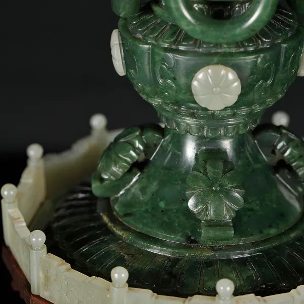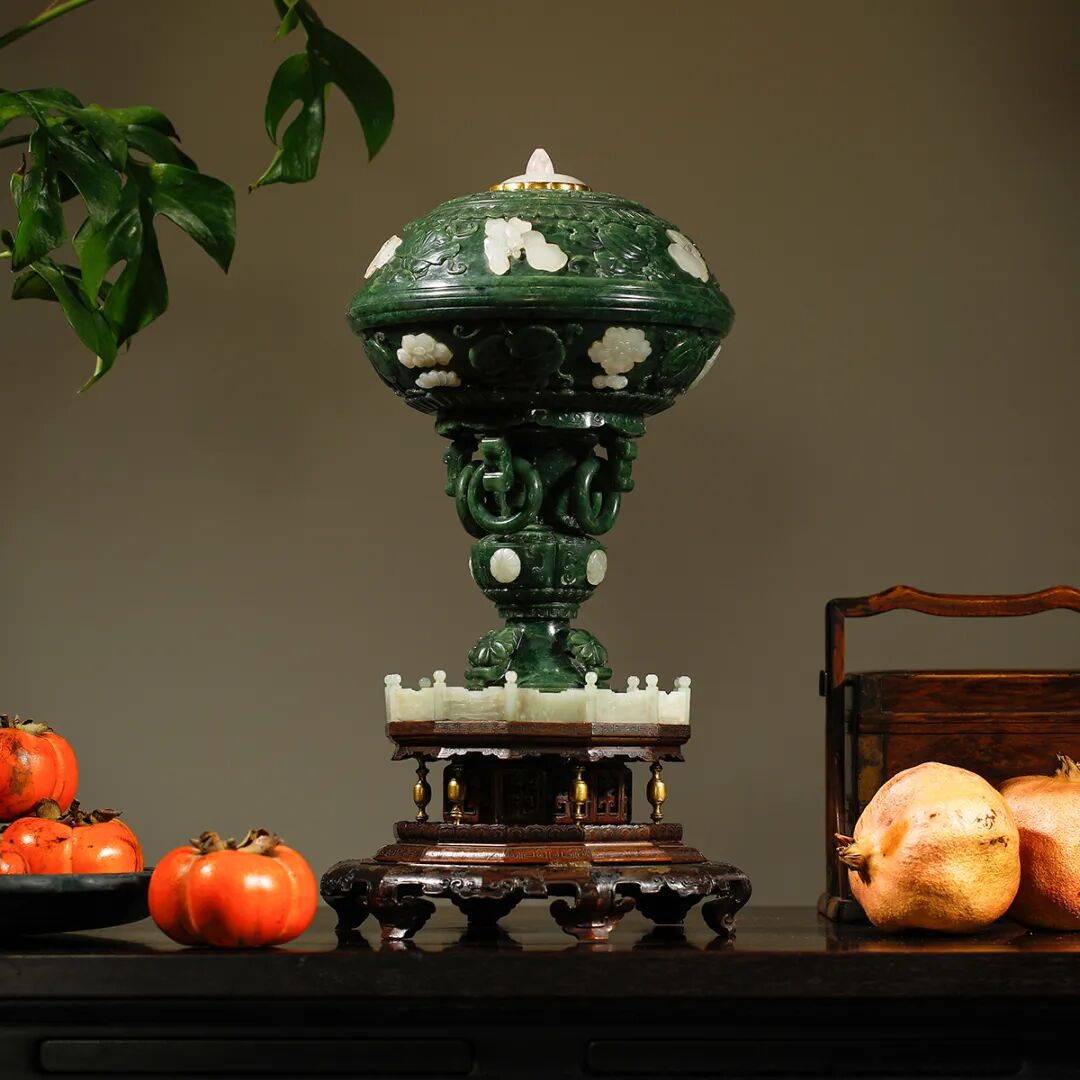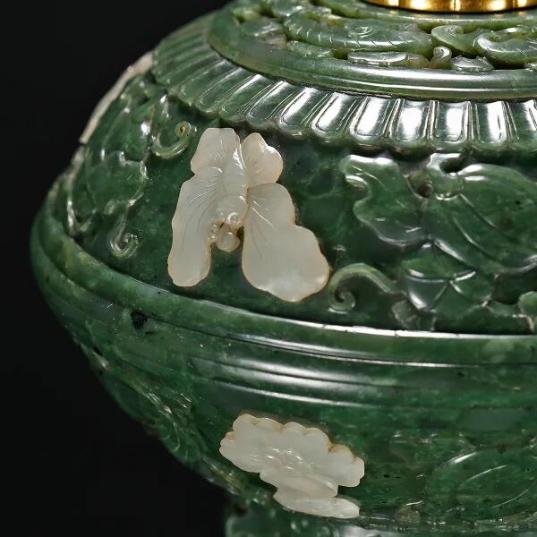 说明:整件以碧玉质为主,由木座、白玉底托、支柱、盖碗四部分组成。盖顶金镶白玉,白玉呈仰莲纹状,上立一珠钮,粉碧玺为作。四周镂空雕刻交杂的如意纹与灵芝纹。盖深翠厚润,其上间以嵌白玉雕刻而成的蝴蝶、牡丹等纹饰,与碧玉浮雕的瓜果纹样相错落,外围装饰一周如意云纹。支柱与器身连接处饰夔龙纹耳,下衔活环,饱满圆润,工艺精湛。腰部鼓凸,以棱线作框,每个开光内均嵌以花形白玉,周边 配以浅雕云纹。