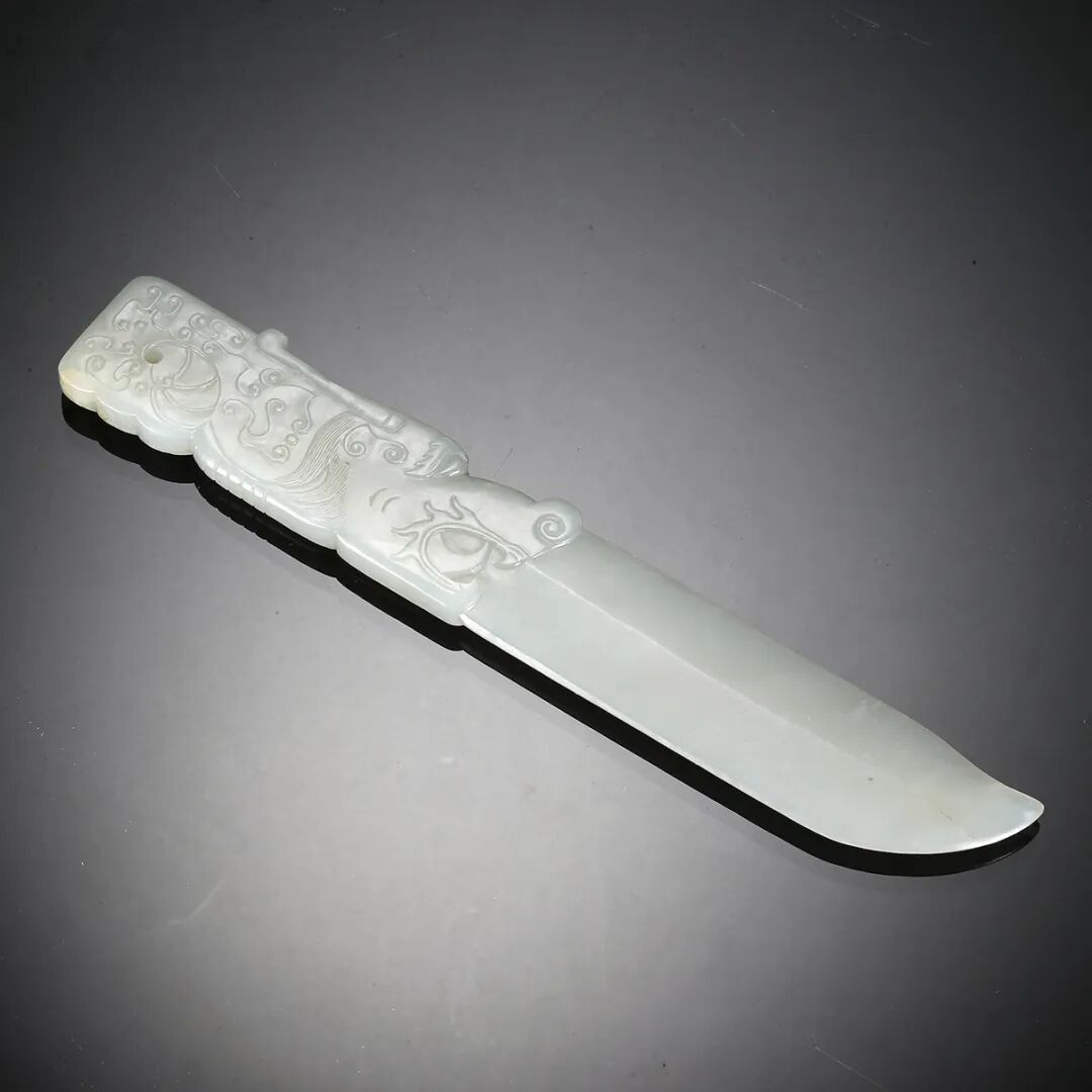 说明:笔筒直身,平底露胎。笔筒内外施透明釉,釉面莹润微泛青,腹部青花通景绘山水人物纹,釉下口沿处暗刻弦纹,口沿及近足处暗刻纹饰一周,俗称“暗花边”,此种装饰手法在天启、崇祯时期颇为流行。画面中山石嵯峨逶迤,近处屋前二人寒暄作揖。林中薄游,慢过澄川,观此画面,若有松风入耳,与画中人一般久然忘其归。整幅画面采用远景相结合的构图方法,在绘画技法上采用勾勒、皴、点、染等绘制而成,颇具文人气息。明末清初时期,景德镇制瓷业呈现出崭新的时代风貌,瓷器的诸多纹饰蕴含浓厚的文人气息,题材之特别,内容之丰富,均开一代未有之奇,而本品可以称得上是这一时期文人瓷绘山水之典型。说明:如意主体以香气四溢的檀香木为材,体形修长,身姿轻盈。如意柄减地阳刻佛教八宝纹,三片优质“孩儿面”饰以剔红螭龙纹,琢刻生动,身形健硕,工艺精湛纯熟。如意纹饰多变,加之精工细作,可能为皇族权贵贺寿进献之物,成为宫廷皇室大臣间地位、财富和家庭和睦的象征。整器呈色文静而雅致,包浆盈盈,持之在手玉润香温,令人不觉动心难以释手。长约:73mm 宽:约54mm 重:约15.20g说明:此绿棋楠形如蝙蝠,福至心灵、气如仙境,空灵幽远;削之可见油线如金丝,纹理清晰,质地软糯。此拍品附证书。说明:玉刀呈片状,质润白无瑕。刀柄雕龙纹,有穿孔,为系绳之用,精细巧妙。刀身线条流畅,中部有脊线耸起,刻法简练,韵味十足,刃口仍有锋锐之感,可做裁纸使用,亦适于文房雅玩。说明:白玉圆雕,制润细腻,抚若凝脂,色泽素雅沉着,古朴恬静。精心雕琢的天尊像头戴莲瓣冠,一手撵须,正襟危坐。人物比例准确,神态安详,须髮精微,衣纹流畅。整个雕像率真简洁,具有较强的艺术感染力。