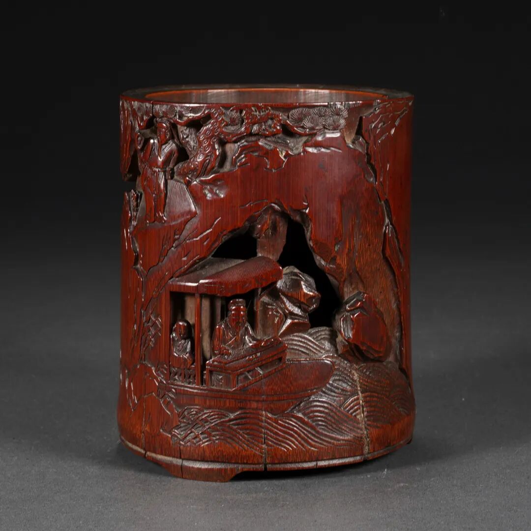 清·竹雕抚琴图笔筒