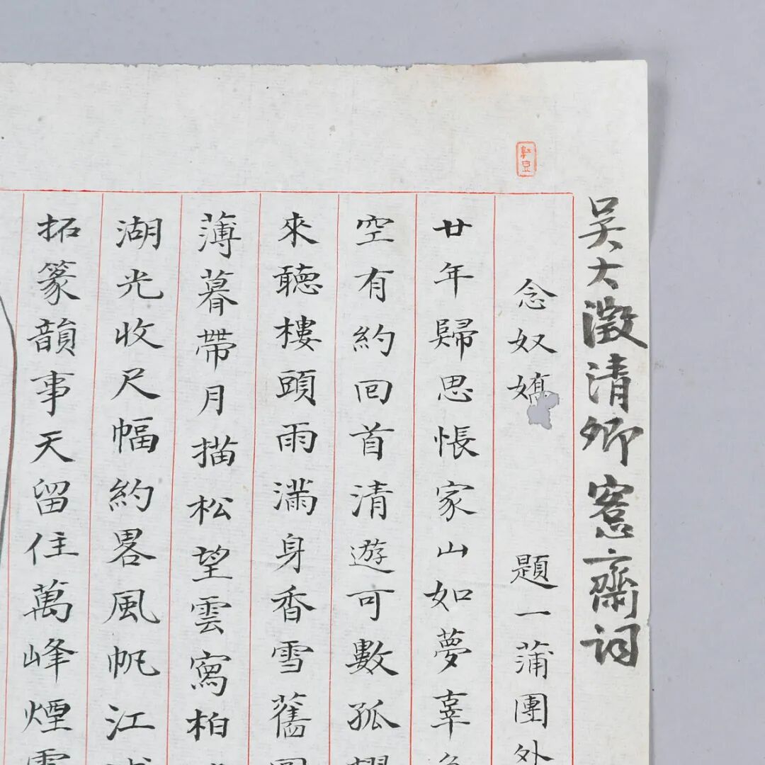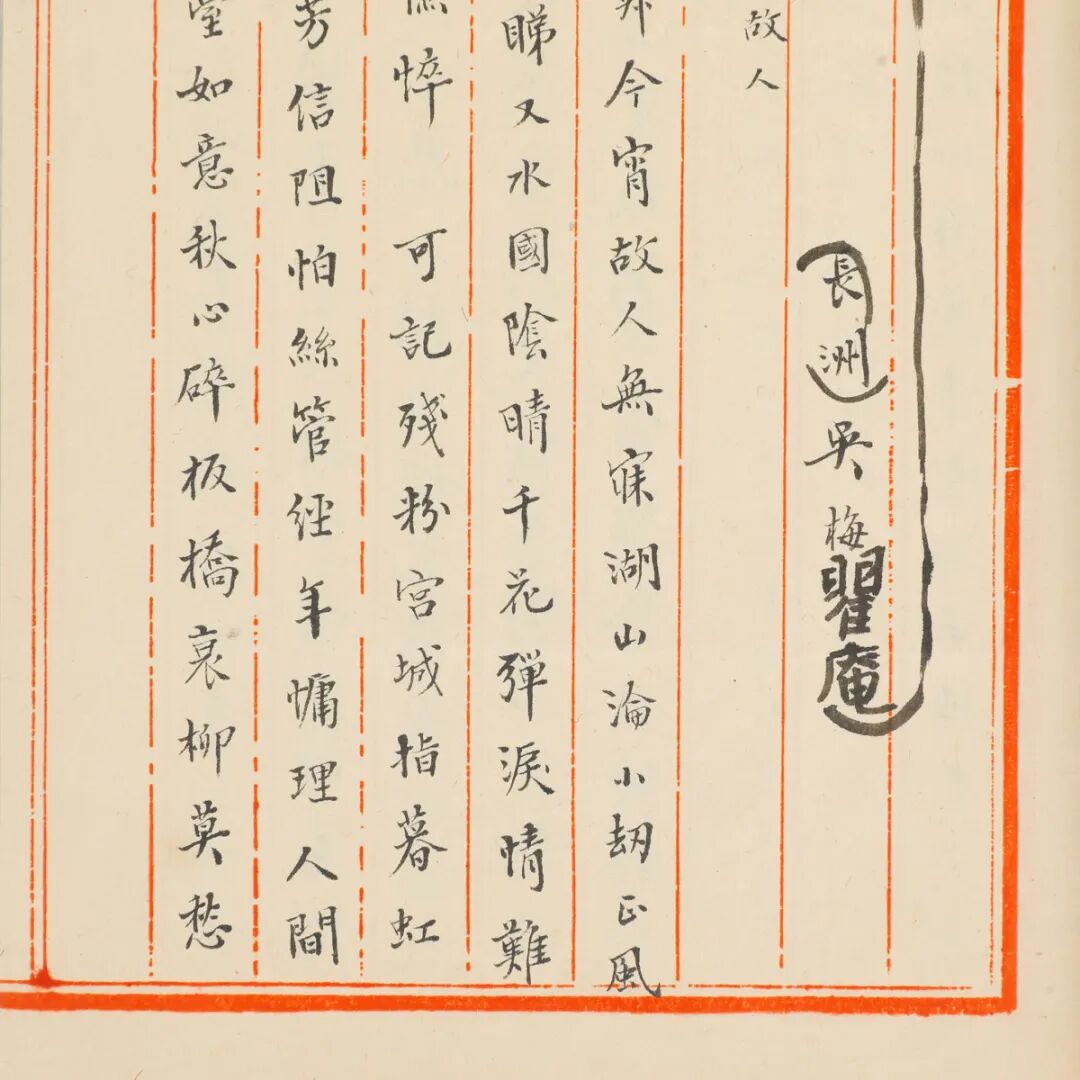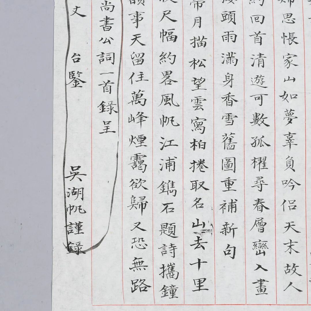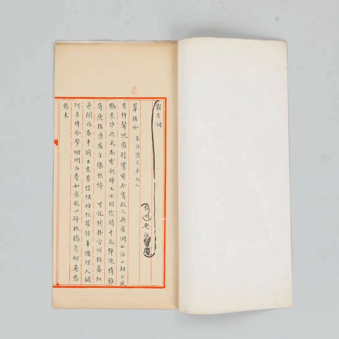 2.《词综补遗》P345-346,林葆恒辑,张璋整理,上海古籍出版社,2005年。3.《中国花卉诗词全集》P731,河南人民出版社,1997年。4.《华夏吴姓家族史》P1005,知识产权出版社,2017年。说明:叶恭绰上款并题跋。此为吴湖帆抄录其祖父吴大澄《念奴娇·题一蒲团外万梅花图,和翁叔平尚书韵》词一首,呈叶恭绰作编选《全清词钞》之用,经叶氏批阅、钤“红豆”印后入选《全清词钞》,并见载于其他诗词集。吴大澄原词为和翁同龢而作。所及《一蒲团外万梅花图》,乃胡锡珪为清末天寿圣恩寺僧人若臞所绘。张鸣珂、易顺鼎等均曾咏该画。吴湖帆填词直接受教于吴梅,1928年与叶恭绰相识后,二人自此结下深厚情谊,并常有诗词往来,受其影响,吴湖帆开始涉入词坛。30年代,叶恭绰筹备编纂《全清词钞》,推荐吴湖帆入编委会参与词钞编纂工作。上款者简介:叶恭绰(1889~1968),字裕甫,一字玉甫、玉父、誉虎,号遐庵,广东番禺人。工书法,擅竹石,精鉴赏。清末京师大学堂毕业。1923年任广东政府财政部长。1931年任铁道部长。建国后,曾任全国政协常委、中央文史馆副馆长、北京中国画院院长。著录:1.《遐庵丛书·广箧中词》卷三P56-58,叶恭绰编,番禺叶氏1935年刊本。2.《霜厓词录》,吴梅著,上海交通书局,1942年。3.《近三百年名家词选》P218,龙榆生编选,上海古籍出版社,1979年。4.《全清词钞》P2004-2005,叶恭绰编,中华书局,1982年。5.《词学季刊》P153,龙沐勋编,上海书店,1985年。6.《清词菁华》P400-401,安徽文艺出版社,1986年。7.《历代名家咏花词全集》P313,博文书社,1990年。8.《中国近代文学大系·诗词集》P814-815,钱仲联主编,上海书店,1991年。9.《吴梅评传》P207-211、213,中国文史出版社,1998年。10.《清词金库》P185,吴仲贤选编,中国农业大学出版社,2001年。11.《吴梅全集·作品卷》P120-123,吴梅著,河北教育出版社,2002年。12.《中大校友诗词选》P68-70,李飞、王步高编,东南大学出版社,2002年。13.《词综补遗》P372-373,林宝恒辑,张璋整理,上海古籍出版社,2005年。14.《民国五百家词钞,》P232-233,中国线装书局,2008年。此为吴梅书自作《霜厓词》线装册七页,含词八首,备叶恭绰编辑《广箧中词》之用,所选皆其心仪之作。诸词见载于《广箧中词》、1942年刊《霜厓词录》、1982年中华书局本《全清词钞》等众多诗词集。稿本经由吴湖帆(湖兄)转交叶恭绰,经叶氏批阅并挑选(钤“红豆”印)后,《翠楼吟·秦淮遇京华故人》《拜星月·次清真韵》《鹧鸪天· 强村词隐图》《瑞龙吟·探梅邓尉,苦念昔尘,归舟惘惘,感吟自遣,步清真韵》四首入选《广箧中词》。上述四首与《广箧中词》与《全清词钞》版本一致,与1942年刊本《霜厓词录》存在大量不同,《浣溪纱慢》《征招》《寿楼春》三首与《霜厓词录》及现存其他著录所载文皆有所出入,可知此稿系早期版本,后复经吴氏斟酌改定。词中涉及朱祖谋(强村),多和周邦彦(清真)、姜夔(白石),系晚清民国词学审美的反映。词作具体包括《翠楼吟·秦淮遇京华故人》《拜星月·次清真韵》《鹧鸪天· 强村词隐图》《绮寮怨·淮张旧址,新拓园林,偶一登眺,百端交集,赋此简艮庐》《浣溪纱慢·海上遇旧燕》《征招·南塘观荷次白石韵》、《瑞龙吟·探梅邓尉,苦念昔尘,归舟惘惘,感吟自遣,步清真韵》《寿楼春·观演旧作湘真阁小剧》。1929年12月,由叶恭绰提议,约集沪上词坛名流朱祖谋、陈方恪等于觉林素菜馆,决议设立《全清词钞》编纂处,由叶恭绰主编,参与编纂者包括朱祖谋、陆维钊等55人,吴梅、吴湖帆皆名列其中。时吴湖帆好填词,曾问学于吴梅,交往甚密。上款者简介:吴湖帆(1894~1968),名万、倩,字东庄,号倩庵、丑簃,江苏苏州人。为西泠印社社员,其梅景书屋培养了王季迁、陆抑非、徐邦达等书画名人。收藏甚丰,精鉴别、填词。山水宗“四王”、董其昌,上溯宋元各家,以雅腴灵秀享誉画坛,为海上重要名家,亦为海上“三吴一冯”之一。鉴藏者简介:叶恭绰(1889~1968),字裕甫,一字玉甫、玉父、誉虎,号遐庵,广东番禺人。工书法,擅竹石,精鉴赏。清末京师大学堂毕业。1923年任广东政府财政部长。1931年任铁道部长。建国后,曾任全国政协常委、中央文史馆副馆长、北京中国画院院长。![]()