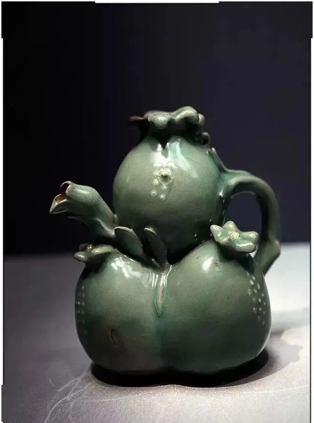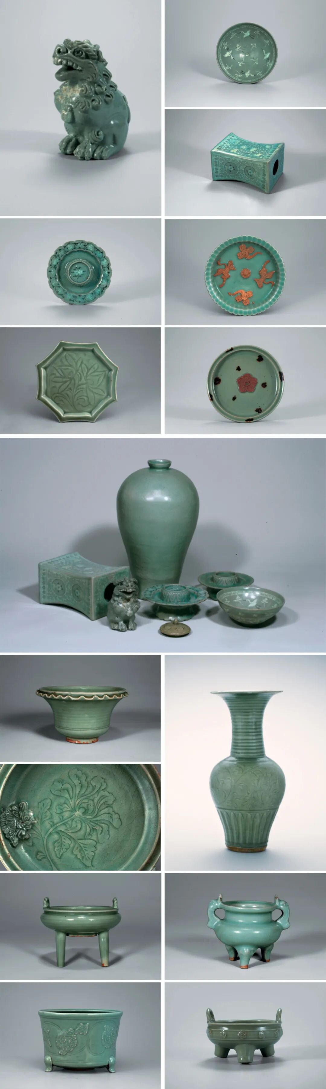 仁宗长陵出土的青瓷瓜形瓶及方形台有类于宋代青瓷的高雅宁静,而青瓷透雕七宝香炉、青瓷透雕唐草纹盒、青瓷镶嵌透雕龟甲纹套盖、青瓷透雕双龙笔插、青瓷龟形水洼注、青瓷堆花莲荷唐草纹水注的华丽精巧,已超过宋瓷,足与金银工艺争胜。