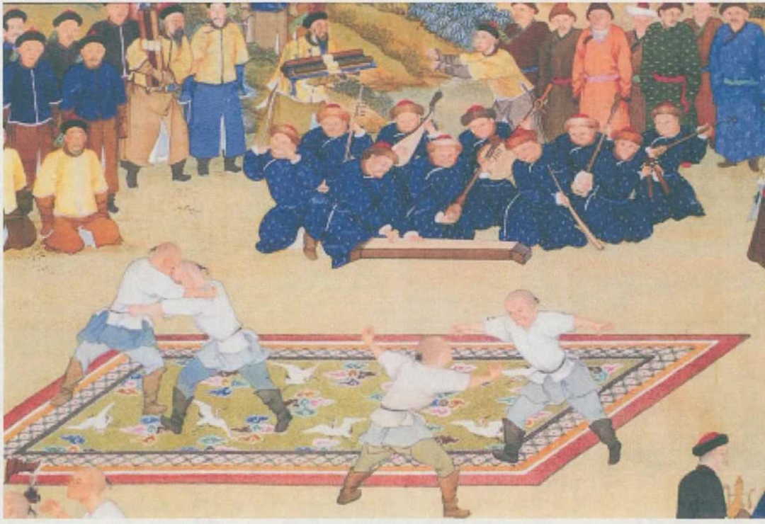 “相扑”即摔跤,满族人称“布库”,是宴会中必备的表演,胜者会得到酒或羊肉等奖励。