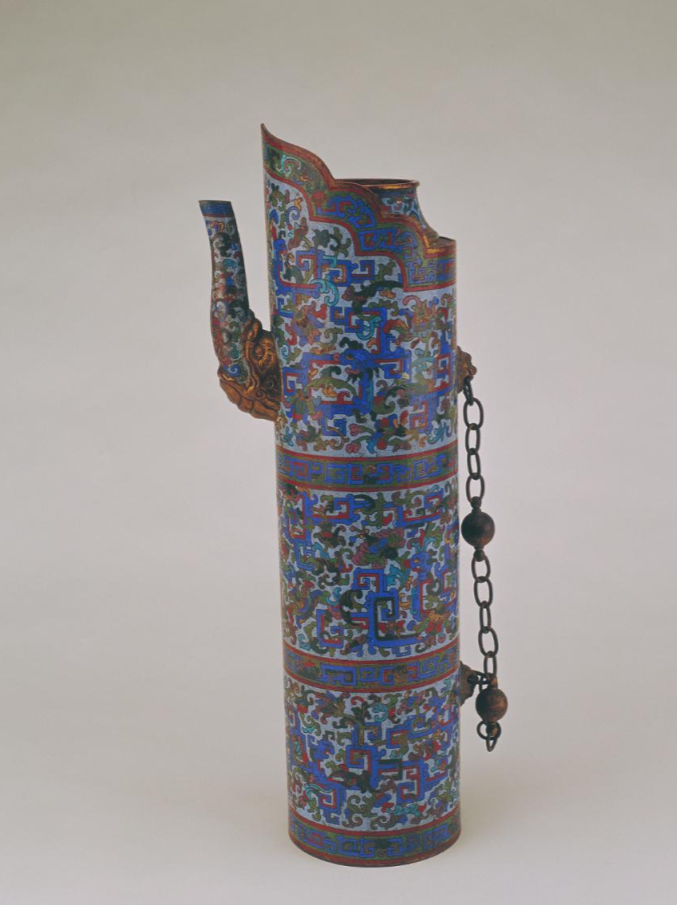 上图最左边一人手持的长形器物为多穆壶,是盛放奶茶的传统器具。此图为清中期錾胎珐琅夔龙纹多穆壶,故宫博物院藏木兰秋狝采用的狩猎方式是传统的围猎法。先选好一片四面皆山、中间较平的地方,出猎当天清晨,三千多名士兵在管围大臣等人的带领下,按固定次序和方位展开,由远及近驱赶野兽,慢慢向中间平地逼近,将野兽合围。最终形成的包围圈,“人并肩,马并身”,密不透风,如铁桶一般。