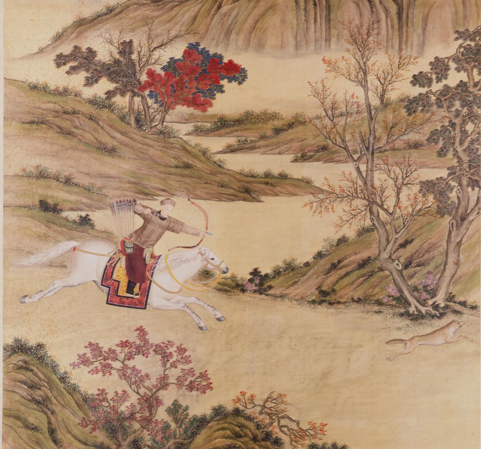 《乾隆皇帝一箭双鹿图》故宫博物院藏皇帝尽兴之后,轮到随侍的皇子皇孙、王公大臣和士兵大显身手。一时间,围猎之地仿佛变成了战场,百骑并发,弓箭齐鸣,众人左奔右突,呼啸山林,酷似一场短兵相接的实战演习,时而人兽交斗,时而围追堵截,受伤的野兽无论逃到哪里,都要捕获。