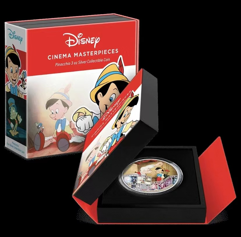 硬币上有匹诺曹和杰佩托的彩色图像,以及可有银片的电影剧照蒙太奇。包装也是非常可爱!