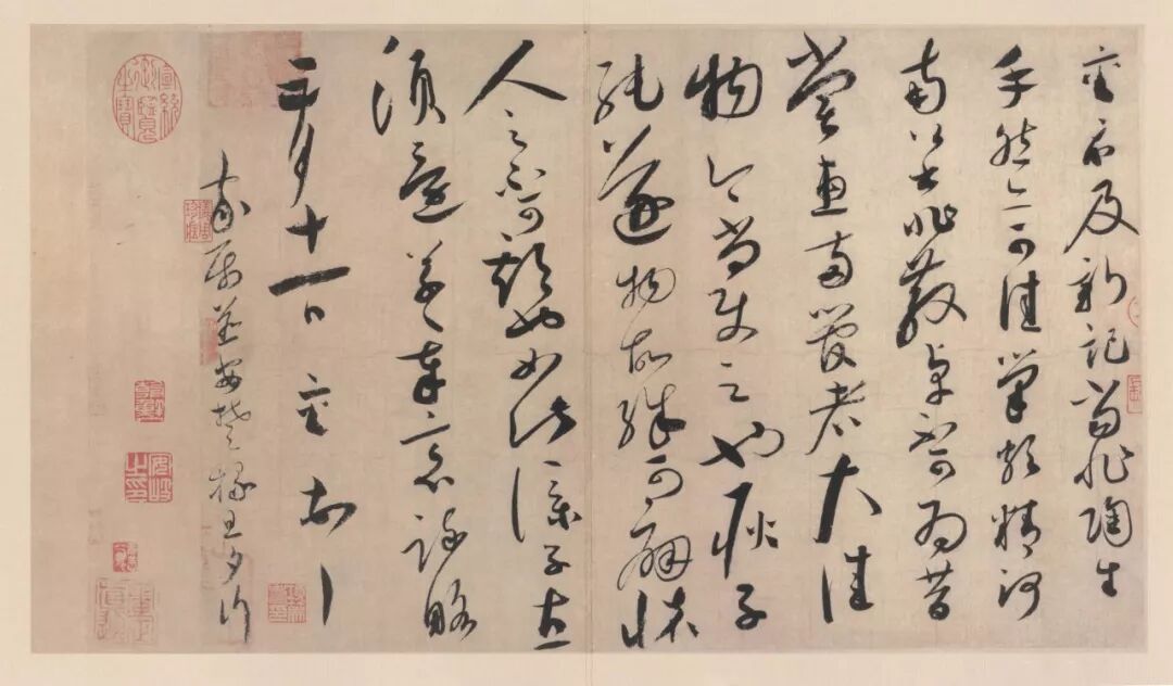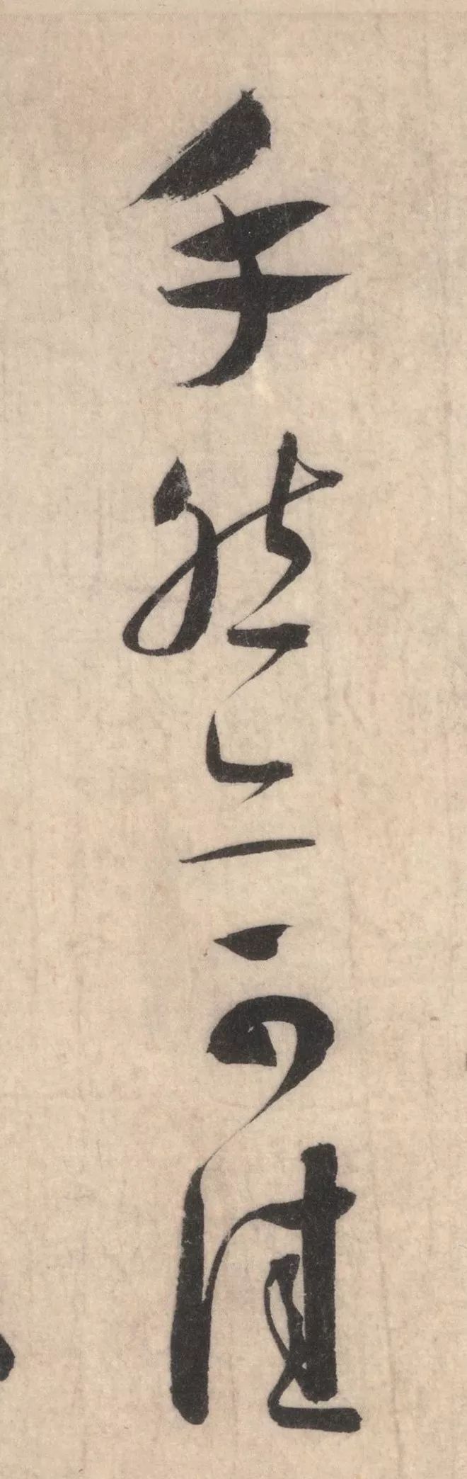 草书《陶生帖》,纸本,纵29.8厘米,横50.8厘米,书于宋皇祐三年(1051),今人曹宝麟先生指出蔡襄《陶生帖》为飞草书代表作,现藏于台北故宫博物院。此帖起笔谨严,字字分明,继而波澜迭起,笔势更为顺畅。在爽意自如之处,字与字连绵不断,点与画的动荡愈发流露出书家的情性之美。整体一气呵成,甚至连形质的使转也不与计较了。请欣赏。![]()