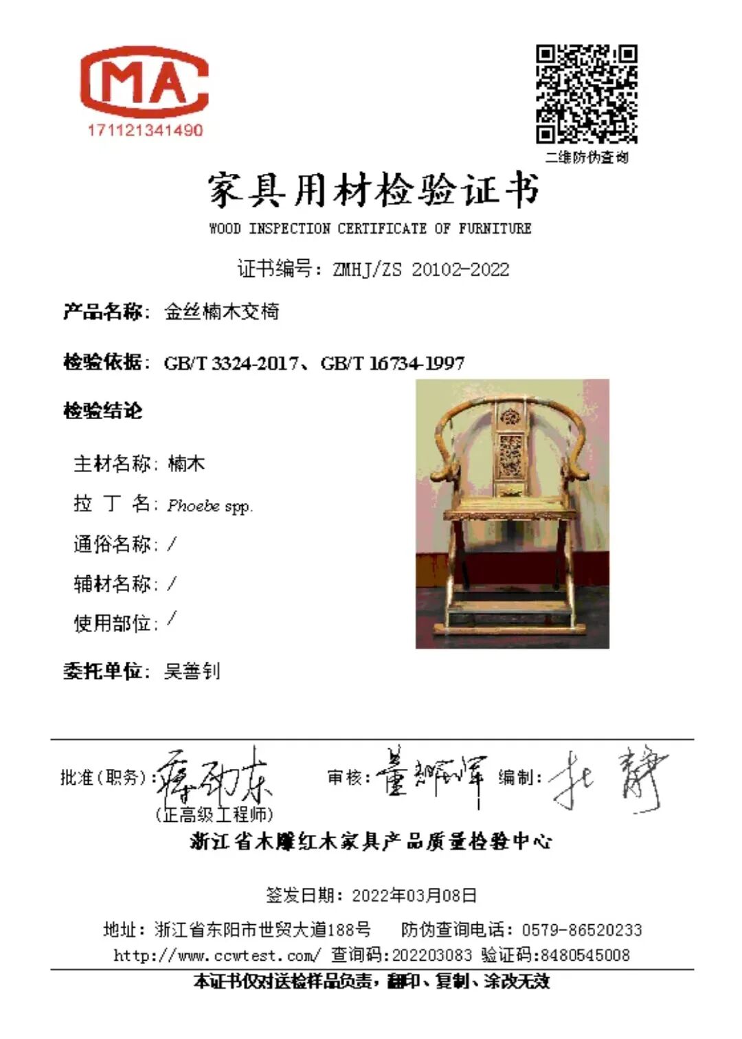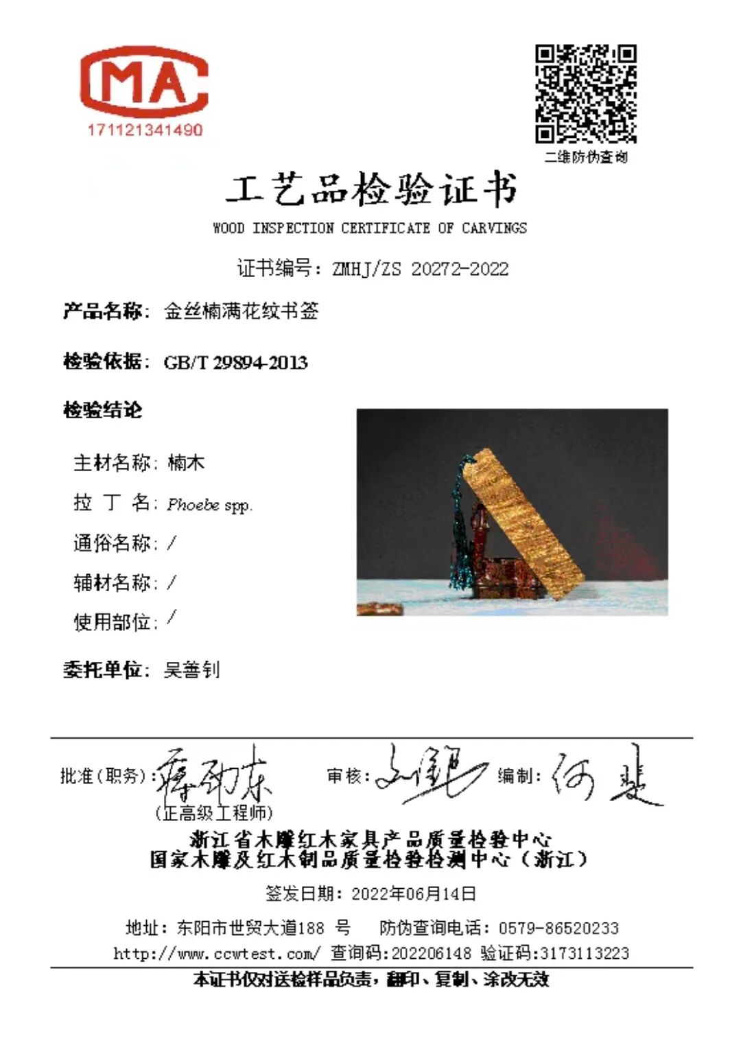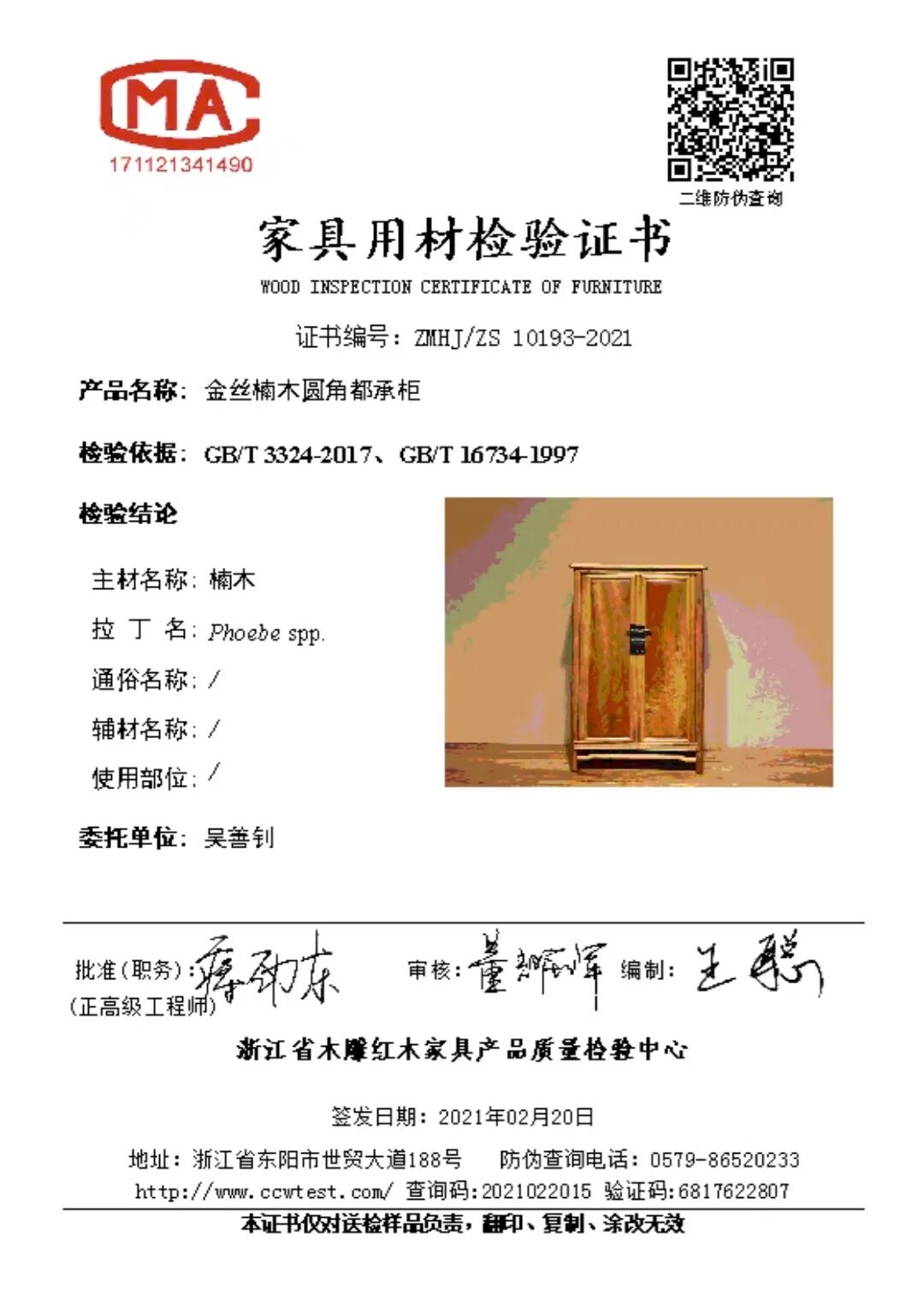 产品有家具用材检验证书,不用担心材质真假问题,,添置家中亦是不可多得的金丝楠木佳品。