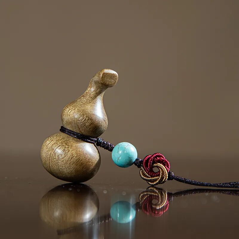 小葫芦挂件上搭配一颗绿松石,颜色明亮娇艳,寓意吉祥如意。
