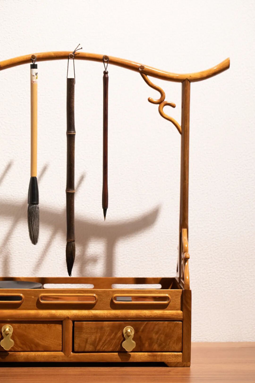 此款金丝楠木都承笔架,以传统榫卯结构一体成型,细节处尽显巧思。