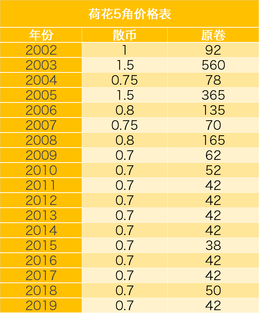 整卷的02年荷花五角 03、05这两个年份的荷花五角存世量少,所以价格也比一般年份要贵一些,达到1.5元左右。 别看普年的荷花5角只比面值多2毛,量大也能赚几百元呢。而且离退市还有好多年,大家平时遇见了就收起来,慢慢攒,等退市了也是一笔不小的财富。请继续关注微信公众号《钱币收藏爱好者》其他文章!