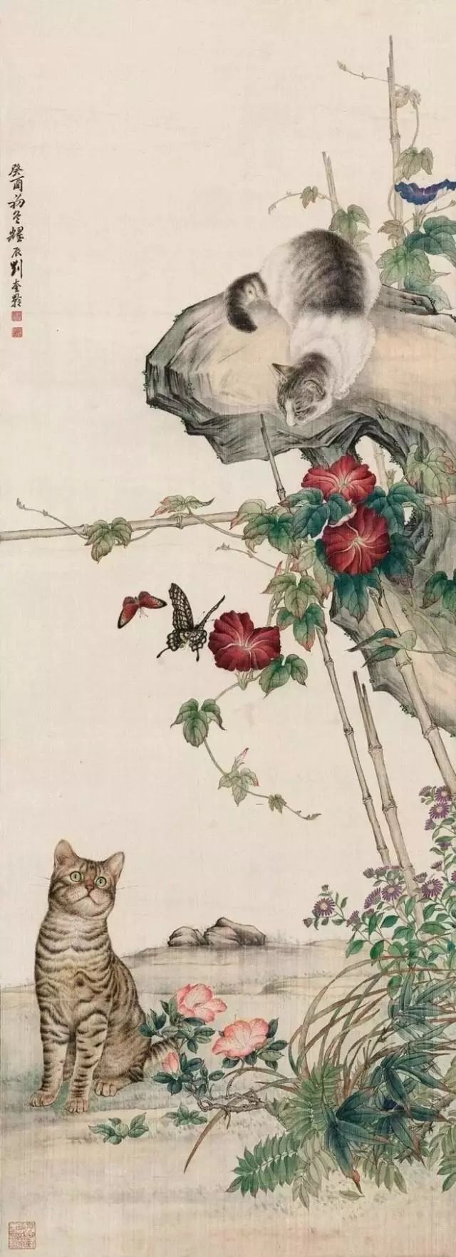 刘奎龄画猫,采用了西方水彩画的“湿画法”与传统中国画的“没骨点染”,惟妙惟肖地表现出小猫的形体结构、皮毛光泽。![]()