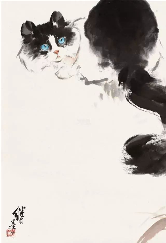 刘继卣画的猫,笔墨大刀阔斧,充满张力,强调一种勃发的生命气息。猫眼炯炯有神,神态栩栩如生。猫身纹理色彩柔和,层次分明,颇有威严。![]()