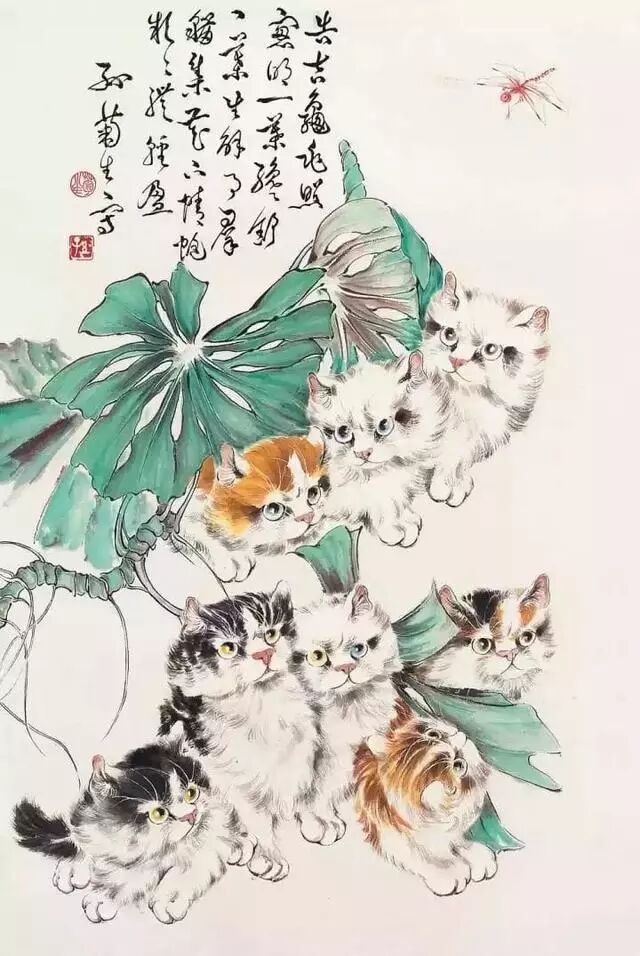 孙菊生二十岁开始画猫。他画的猫,介于工笔与写意之间,生动活泼,意趣盎然,给人以呼之欲出之感。![]()