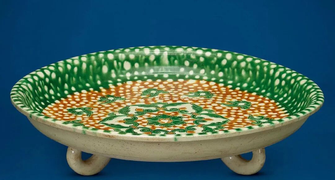 三彩戳印宝相花纹三足盘,唐代