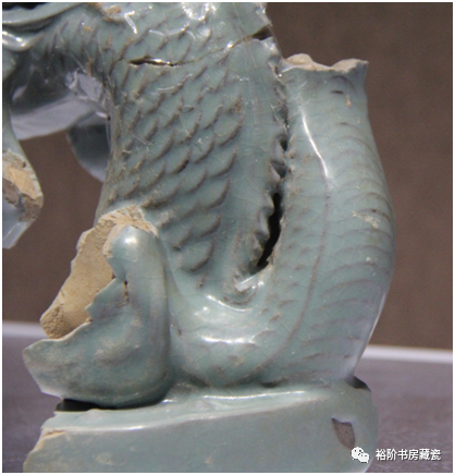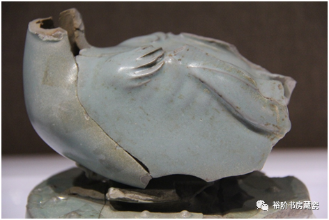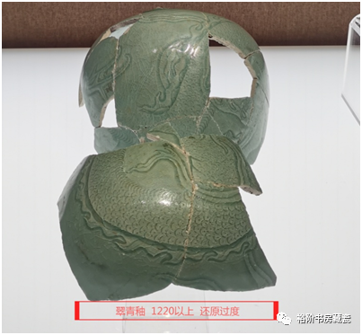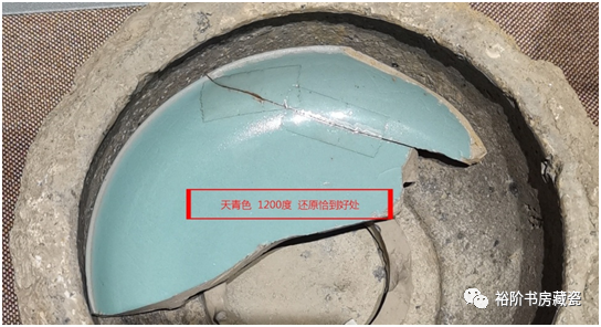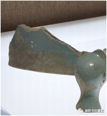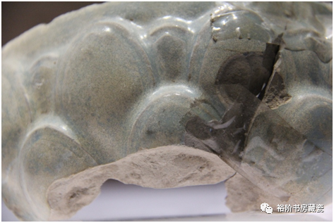 宝丰汝窑博物馆展出天青釉龙形香薰盖修复件,腐蚀不明显。这种就是属于原始堆积层未被后期污染,出土的标本釉色相对较好,胎的断面呈土黄色。