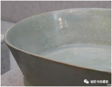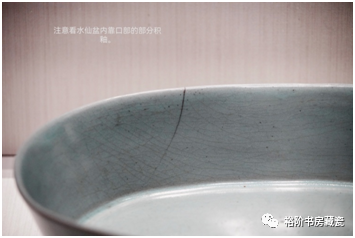 台北故宫博物院收藏的最大汝窑天青釉水仙盆。口沿上有隐约的“回头釉”现象,这种积釉情况较多见,图片不容易看得出来。