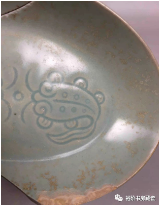 汝窑双鱼洗残片釉色偏黄,温度较低还原气氛弱,私人收藏。