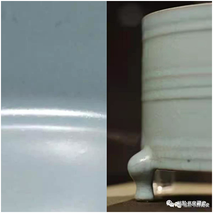 汝瓷的釉还会呈现局部“积釉”现象,“积釉”处釉层明显厚很多。