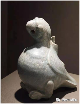 宝丰汝窑博物馆展出天青釉鸳鸯形熏炉盖残件。腐蚀明显,由于堆积层长期被污染渗透,土质呈黑褐色,腐蚀部位呈现浅褐色块状。