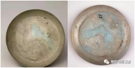 故宫博物院收藏私人捐赠的汝窑天青釉洗,腐蚀明显,器身有白色的“碱锈”斑。
