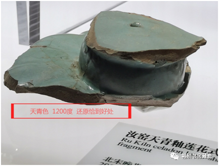 宝丰汝窑博物馆展出的一片洗的残片,洗的立面是虾青色,内底是天青色。