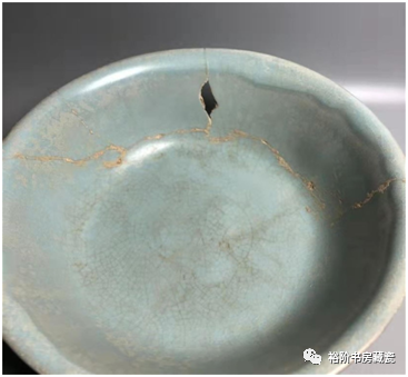 汝窑天青釉碗修复件有明显的“回头釉”现象,私人收藏。