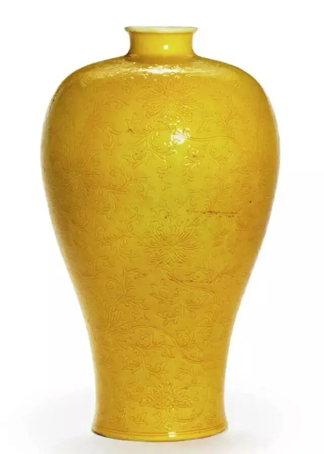 此梅瓶肩丰硕而挺阔,胫部内收,至近底处又微撇,通体施以黄釉,色泽尊贵,表面均匀暗刻缠枝莲纹,刻工一流。