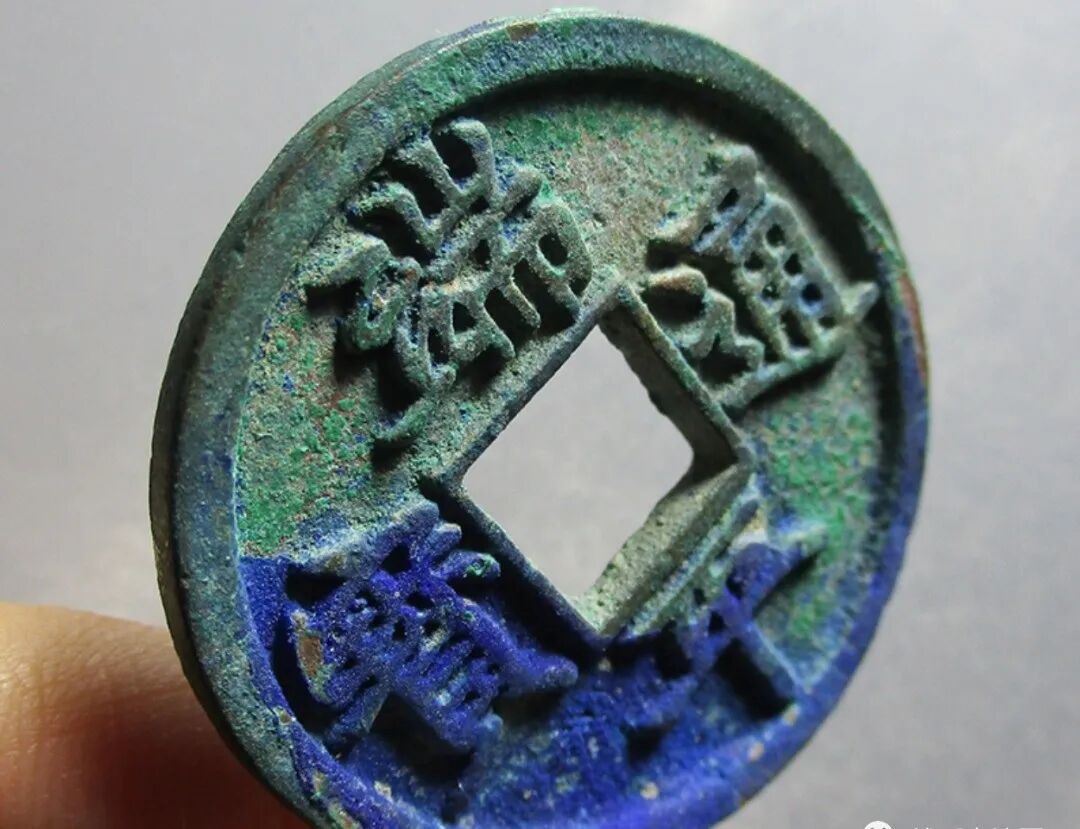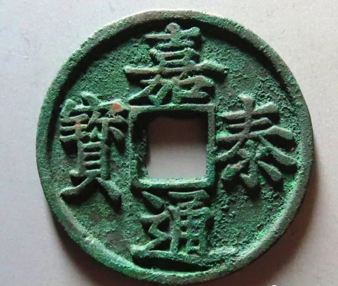 南宋宁宗嘉泰年间(公元1201~1204年)铸,楷书面文,有小平,折二纪年钱,折三钱光背无文,又有小平、折二铁钱。嘉泰通宝小平、折二背记年市场价格在20元左右,折三市场价格在400元左右,折三钱前些年也就几百块钱,但得益于西溪坑出来的一批蓝绿美锈,价格暴涨,只要完整无缺带有美锈的嘉泰都已经暴涨到2000~4000元左右。