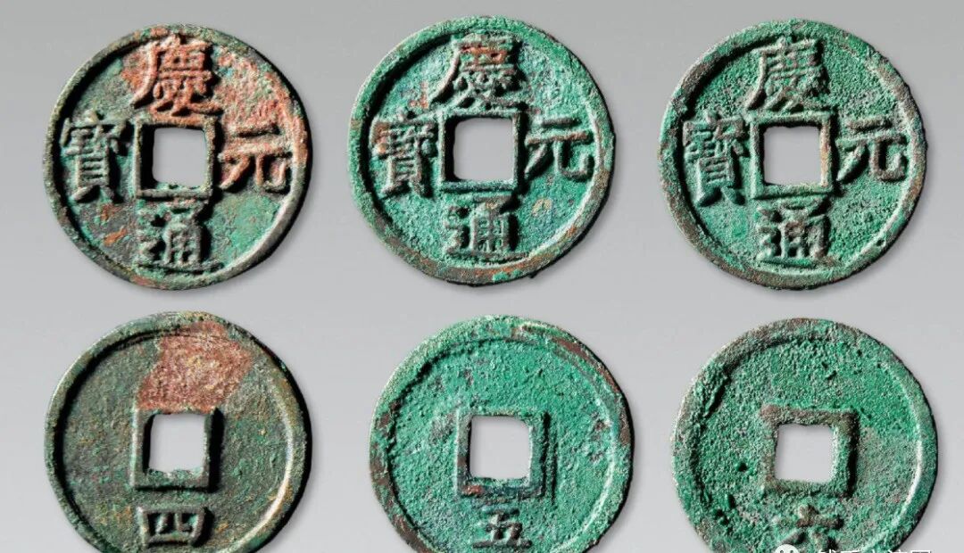 南宋宁宗庆元年间(公元1195~1200年)铸造,有小平、折二、折三等,铜、铁均有,种类较多,另有庆元元宝。庆元通宝种类较多,铜钱小平、折二背记年市场价格在20元左右,折三背记年“四、五、六”市场价格在300元左右,折三背记年“三”属试铸性质,存世稀少,市场价格在2.5万元左右,另有折五型背“永”大钱,瘦金体书,罕见,普通小平铁钱市场价格在50元左右,折二、折三铁钱在30元左右。庆元元宝铁钱不难见到,均为巩州惠民监铸,普通品种市场价格在50元左右。