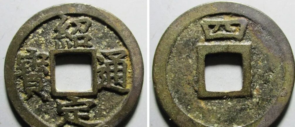 南宋高宗赵构绍兴年间(公元1131~1162年)铸,有小平、折二,铜、铁均有,铜钱官铸小平较稀见。绍兴元宝铜、铁均有,铁钱稀见,而铜钱中的官铸小平钱价值较高,好品1万以上,常见的折二存世量较大,价值几十块钱。绍兴通宝小平钱有一定的存世量,市价300~800元左右,折二也不值钱,另有名珍折三、折十旋读大钱,市面上根本见不到,也就不多介绍了。