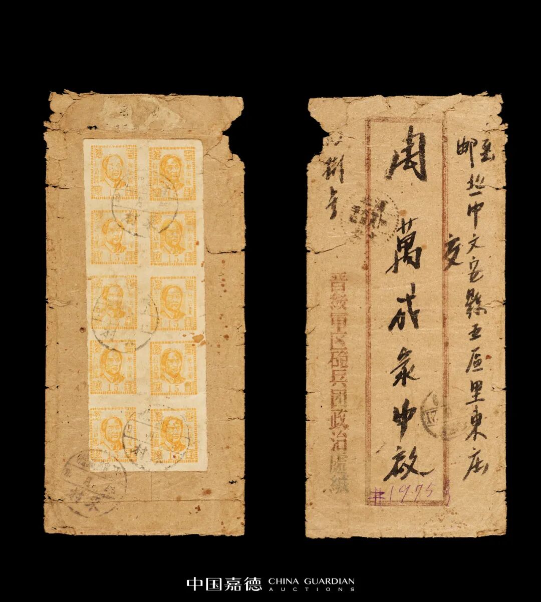 背面贴晋绥第一版毛泽东像邮票15元十方连,合计邮资150元,销晋绥朔县东村手填日期式邮戳,未填日期,封正面盖晋察冀6月21日中转戳,河北文安县1947年6月30日到达戳,贴晋绥第一版毛泽东像大方连邮票实寄封极为少见,保存完好
