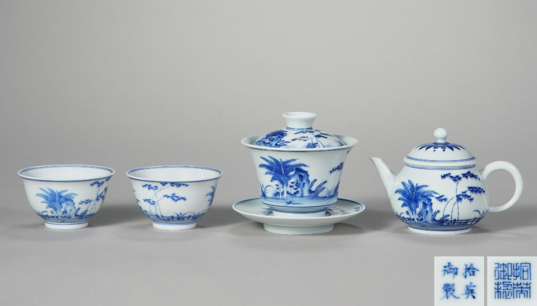 壶:L:13.4cm,盖碗:D:10.2cm,杯:D:8.5cm 拾英御制致力于景德镇仿古陶瓷,拥有完善的产品研发体系和数十位资深陶瓷工艺美术师。其作品以青花为主,承袭御窑精工,恪守匠心文脉,从研制料水、釉色到绘画装饰、烧成技术,逐一攻克,器物风格静秀典雅,精益求精。