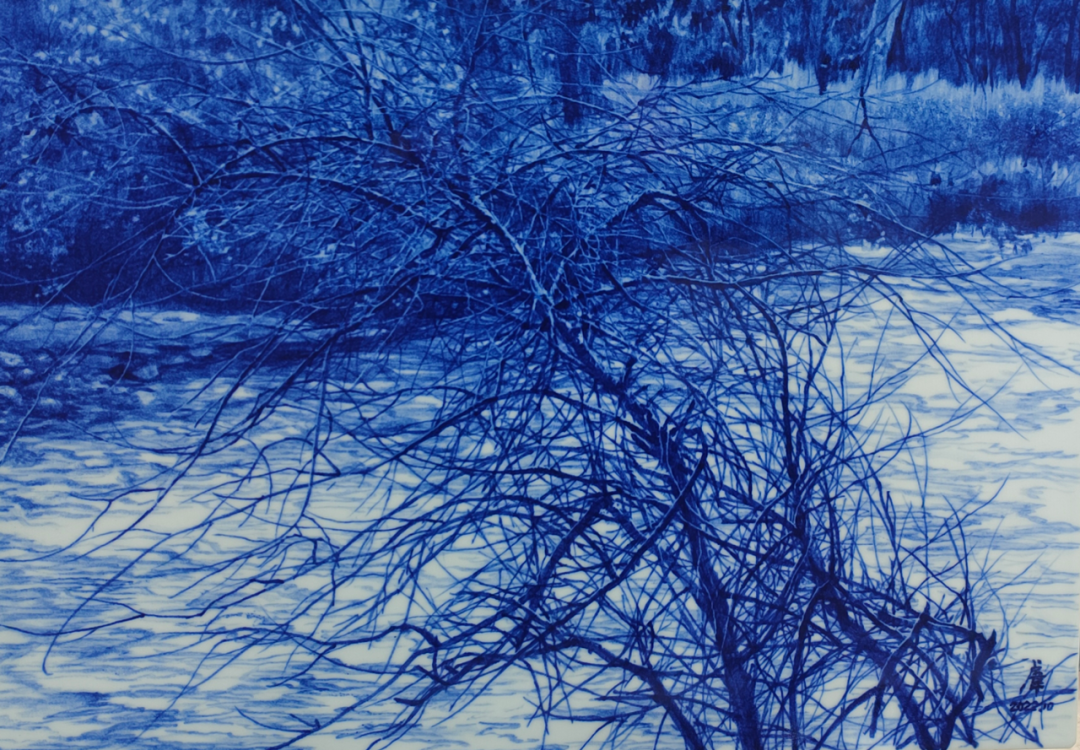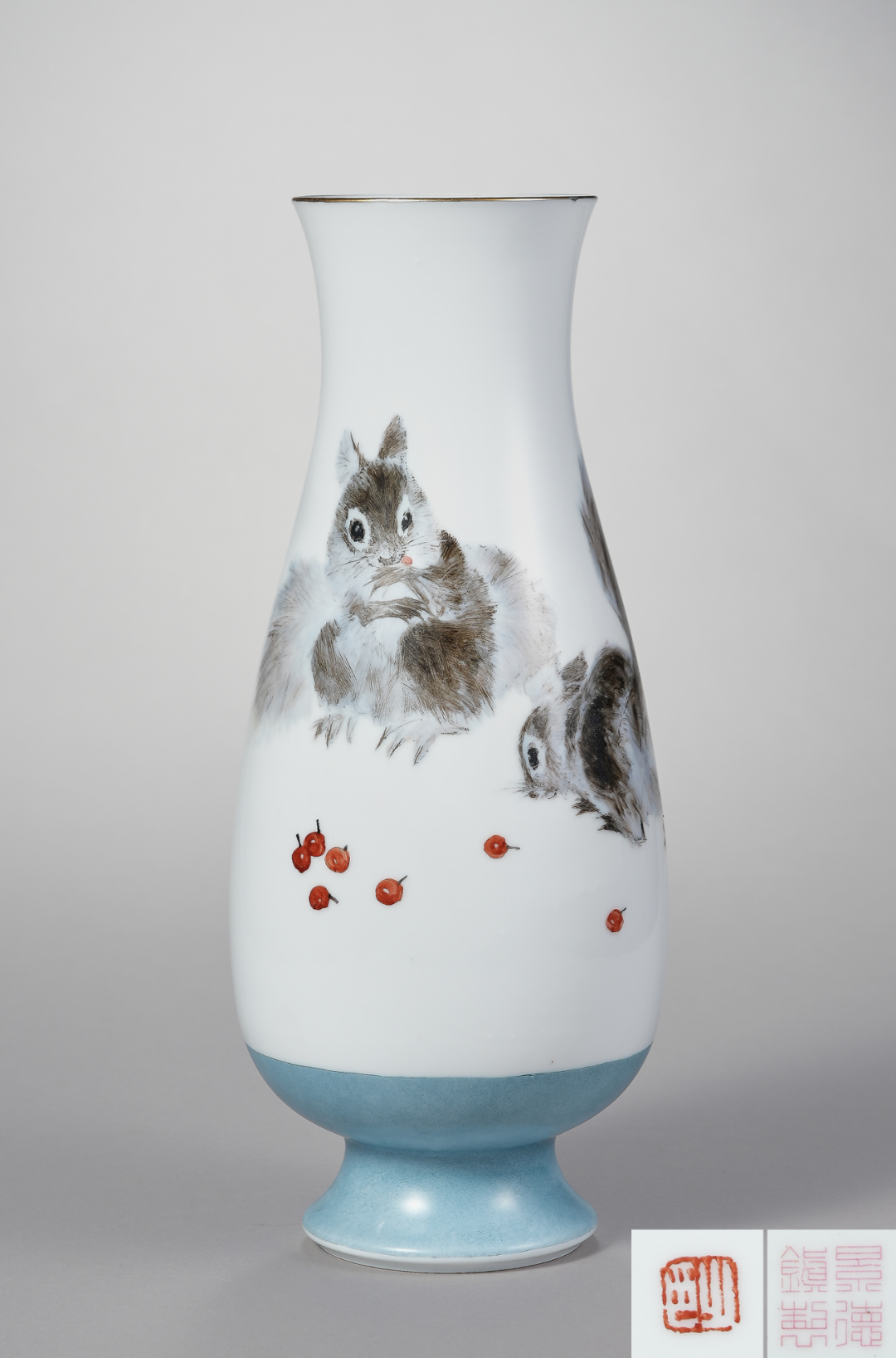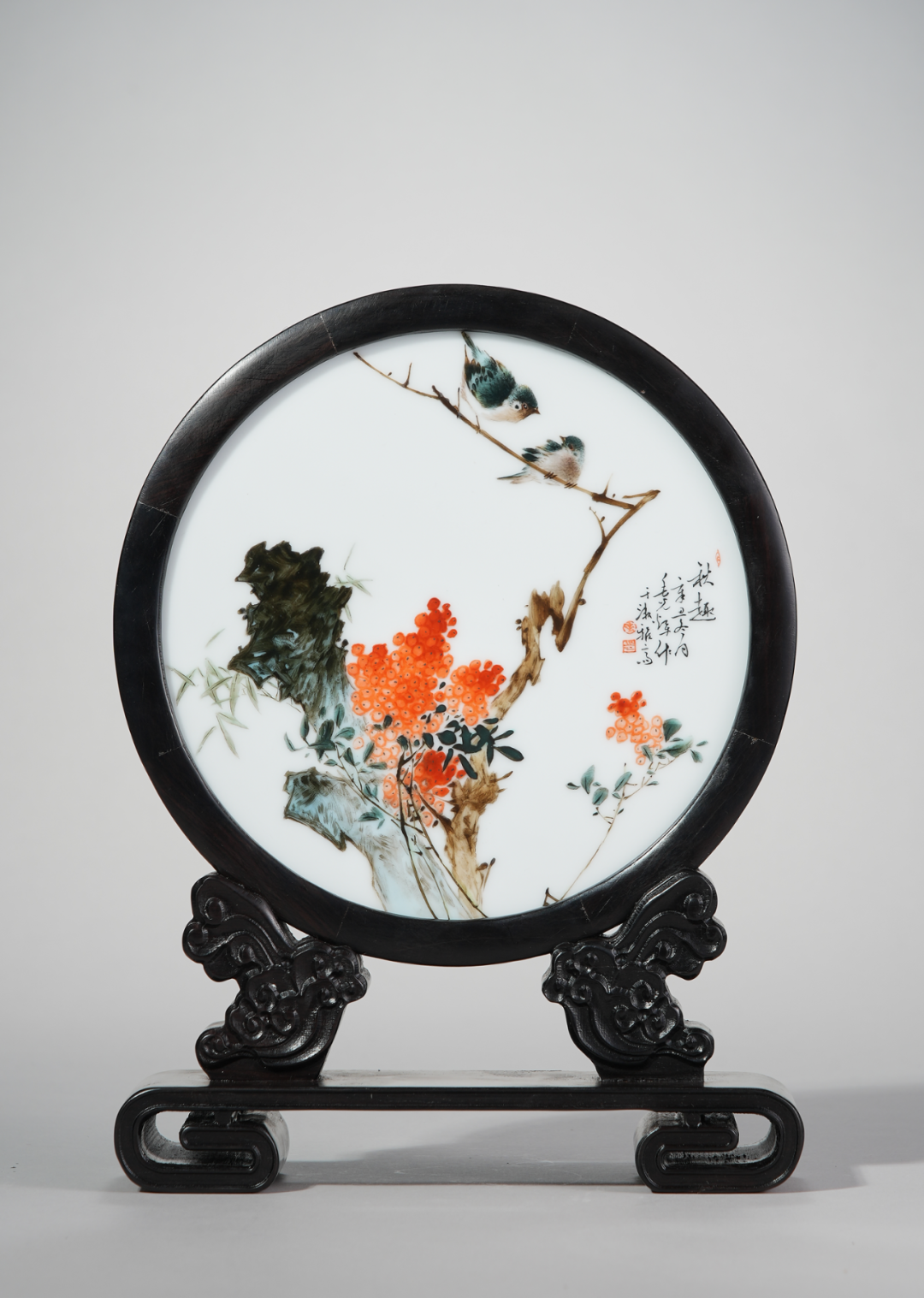 毛光辉,江西省陶瓷艺术大师,1976年进入艺术瓷厂工作,从事陶瓷美术绘画,师从中国陶瓷美术家邓肖禹先生,主要负责绘画的创作设计工作。至今在陶瓷绘画领域已深耕45余载。通过几十年潜心钻研,将传统陶瓷粉彩花鸟绘画传承创新,开创出独树一帜的毛氏陶瓷花鸟画风,被陶瓷绘画后辈广泛学习。其陶瓷绘画生涯中桃李无数,其中不乏业中翘楚,比如江西省高级工艺美术师梁文君,江西省工艺美术师鄢珍等。枯枝、天竺子和竹子等配景都表明这是一幅寒意深重的秋景图。三角形构图和棱角分明的大石头都透露出冷峻的意味,然而一对胖嘟嘟憨态可掬的小鸟却打破了这种寒冷萧索,他们似乎在愉快地聊着什么,给这个冷秋带来一丝暖意。天竺子热烈的色彩也是对这种温暖的呼应。整件作品画面精炼,用笔洒脱,意蕴无穷。