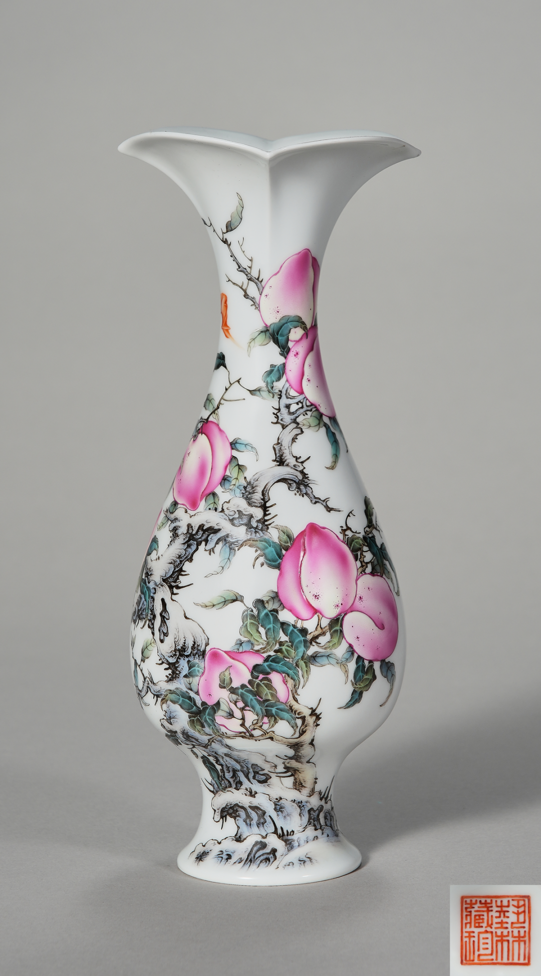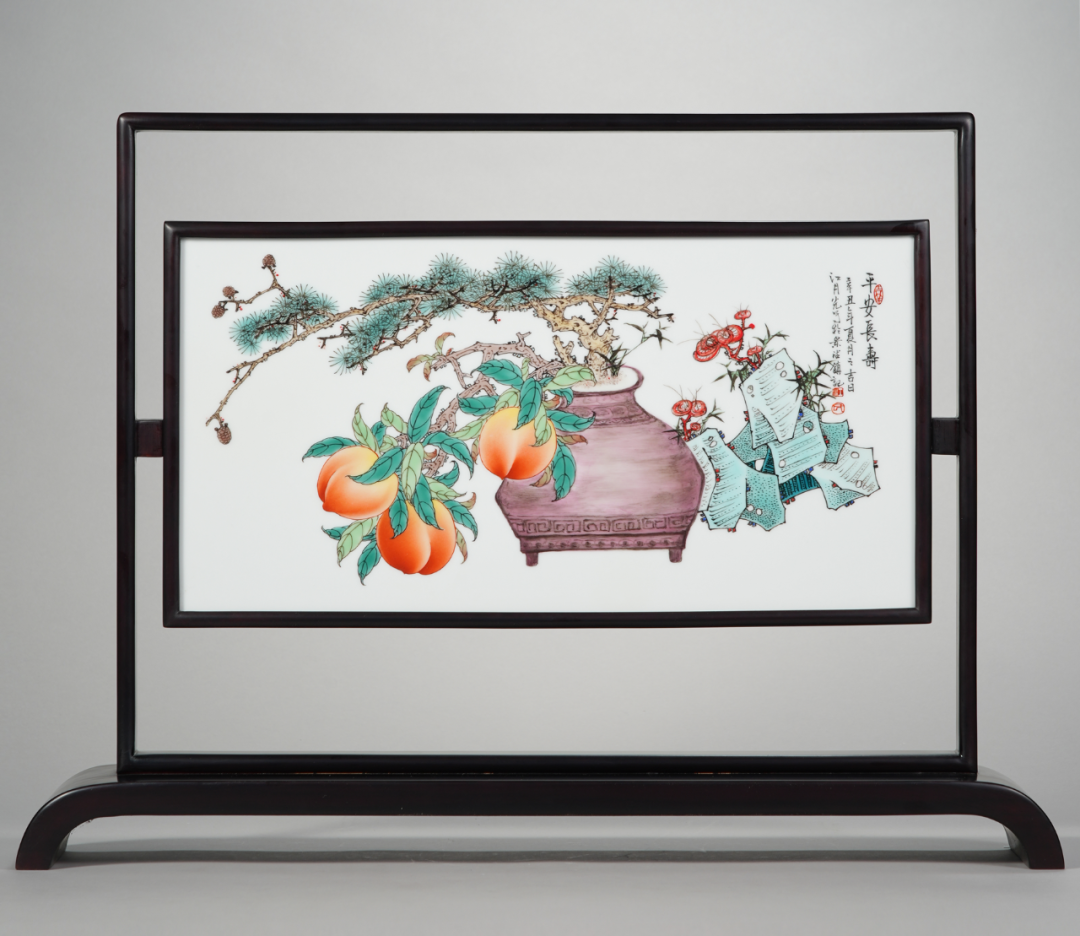 款识:“平安长寿。辛丑年夏月之吉日。江月光写于景德镇记。”江月光,又名江皓,艺号“月宝斋”。1979年生于江西鄱阳,毕业于景德镇陶瓷学院美术系,中国陶瓷艺术大师陆如先生关门弟子。景德镇市古彩非物质文化遗产传承人,荣获景德镇市五一劳动奖章,景德镇市劳动模范先进工作者,享受政府特殊津贴。景德镇高级工艺美术师,景德镇芝山画院副院长,饶州画院副秘书长,就职于景德镇市陶瓷研究所,香港美协理事,景德镇学院客座教授,中国工艺美术学会会员,江西省工艺美术学会会员,景德镇市美术家协会会员。