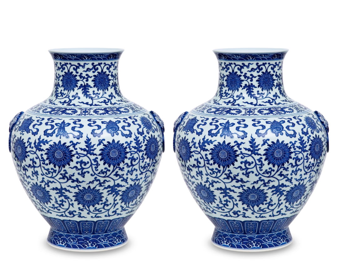 估价:RMB 1,360,000-1,660,000作品设计源自“乾隆青花缠枝莲八吉祥纹大瓶”,原器高52cm、腹瓶颈39cm、现收藏于故宫博物馆。该作品主题纹饰为缠枝莲托八吉祥纹。口沿、足外墙饰海涛纹,腹下部饰莲瓣纹。器形规整,形体硕大,是典型景德镇官窑烧造的作品。乾隆朝器常以八吉祥纹和青莲相配合作为纹饰图案,具有较浓厚的宗教色彩。青花器多绘缠枝莲纹,以青莲谐音“清廉”。八吉祥(亦称八宝贴耳尊)纹自西藏喇嘛教传入,始见于元代,流行于明、清两代,其排列有一定规律。清代八吉祥纹按轮、螺、伞、幢(盖)、花、罐(瓶)、鱼、肠(结)顺序排列。此件作品是2004年指定华弘为中南海紫光阁制作的系列作品。