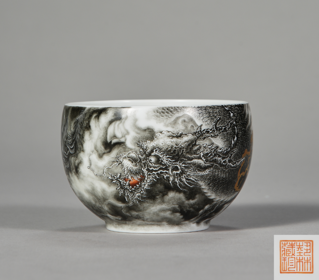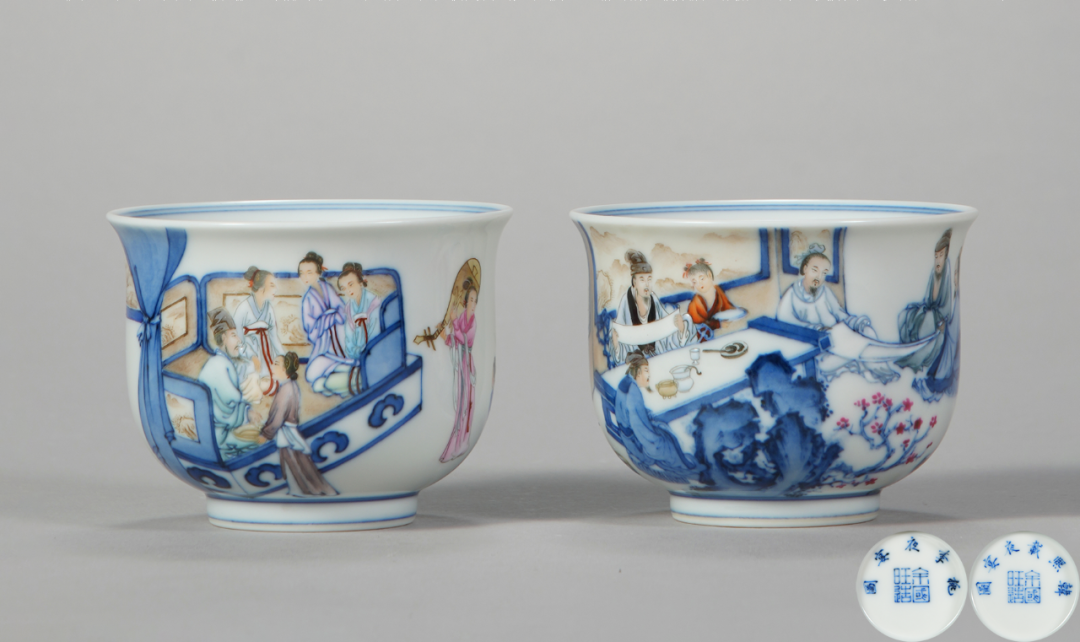 余寅窑 青花加彩之桃李夜宴图杯、韩熙载夜宴图杯一对 底款:“余国旺造·桃李夜宴图”、“余国旺造·韩熙载夜宴图” 余国旺,1974年生,属虎故取笔名余寅。江西省工艺美术师。从艺二十余年,醉心陶瓷艺术创作,身在景德镇拥有得天独厚的官窑陶瓷工艺的土壤和众多前辈大师的悉心指导。2008年创立余寅窑。景德镇陶瓷历史源远流长,制瓷工序繁多,除经作胚,施釉和烧窑的层层考验,每一道环节都凝聚着制作者的心血。余国旺组织身怀特长的各路精英,打造了一支以官窑精神为核心的制作团队,不断学习和传承御窑的文化底蕴。用心与手艺融合泥与火,设计烧造出精美绝伦的佳品。经过十余年的发展,余寅窑从个人工作室发展到名窑工坊,更将陶瓷工艺研究和中式美学生活相融合,深入挖掘中国传统文化的精神内核,把它们融入茶器,融入生活。
