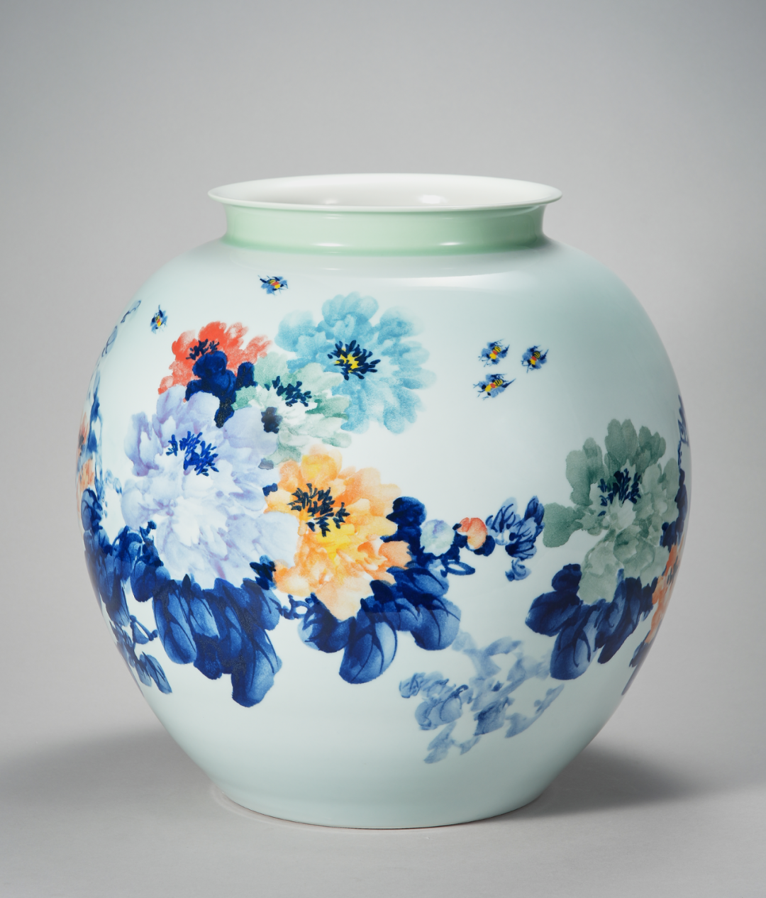 徐国琴,1966年出生于江西景德镇,江西省陶瓷艺术大师,江西省教授级高级工艺美术师,非遗传承人,国家用瓷办公室首席设计师,中国工艺美术学会理事,景德镇美术家协会会员,景德镇女陶瓷艺术家协会理事,景德镇陶瓷职业技术学院客座教授。“青花大王”王步第三代传人。本作品胎釉俱佳,造型圆硕,釉面温润如玉,画面构图随器赋形,疏密有致,开合水到渠成。将中国画中的没骨画法和陶瓷材质有机的融入到一起,达到画面光亮平滑,清雅明快、晶莹润泽,具有饱满的水份感,给人静中有动的感觉。是看得见、摸不着,美中藏秀、光影闪动、妙趣横生,充分体现出牡丹花盛开时绽放出的光彩。