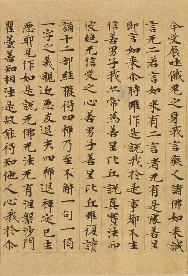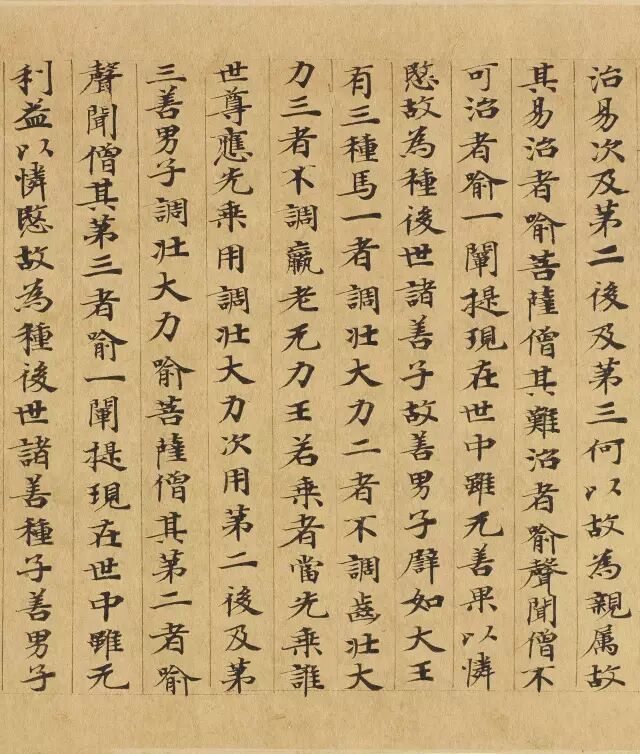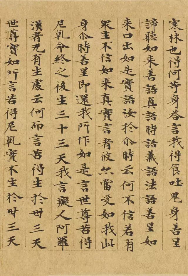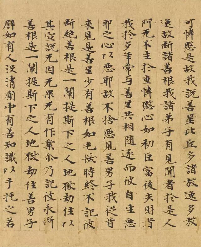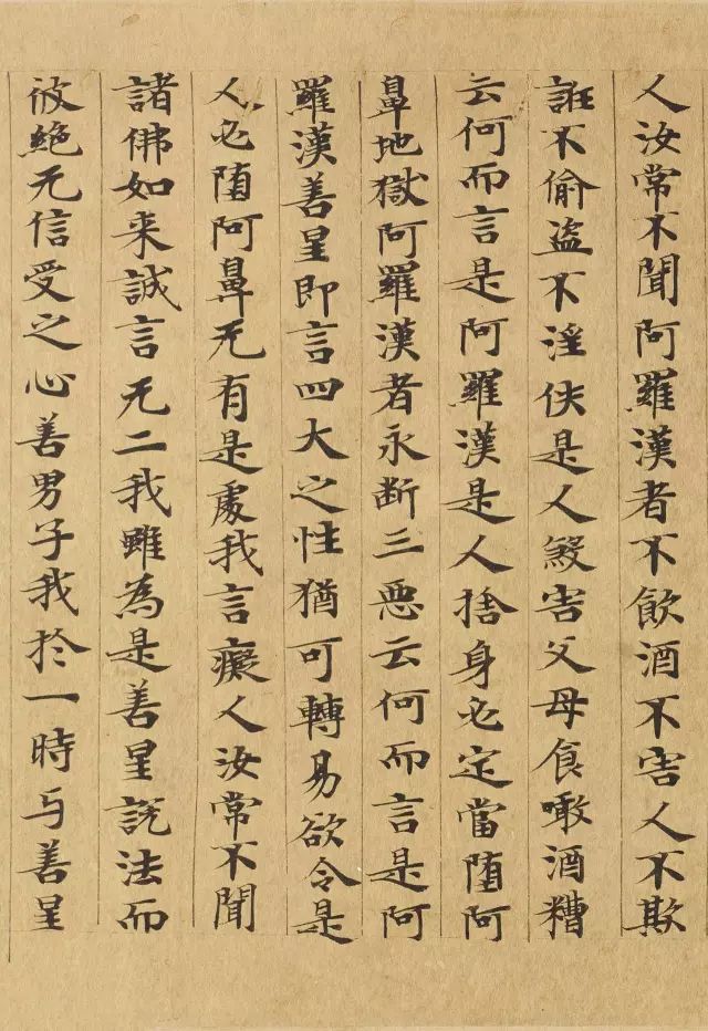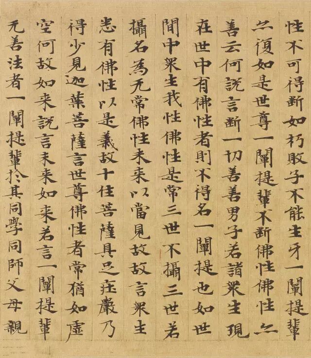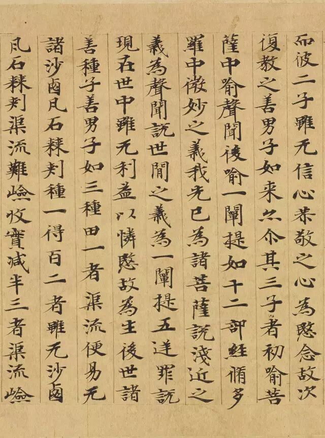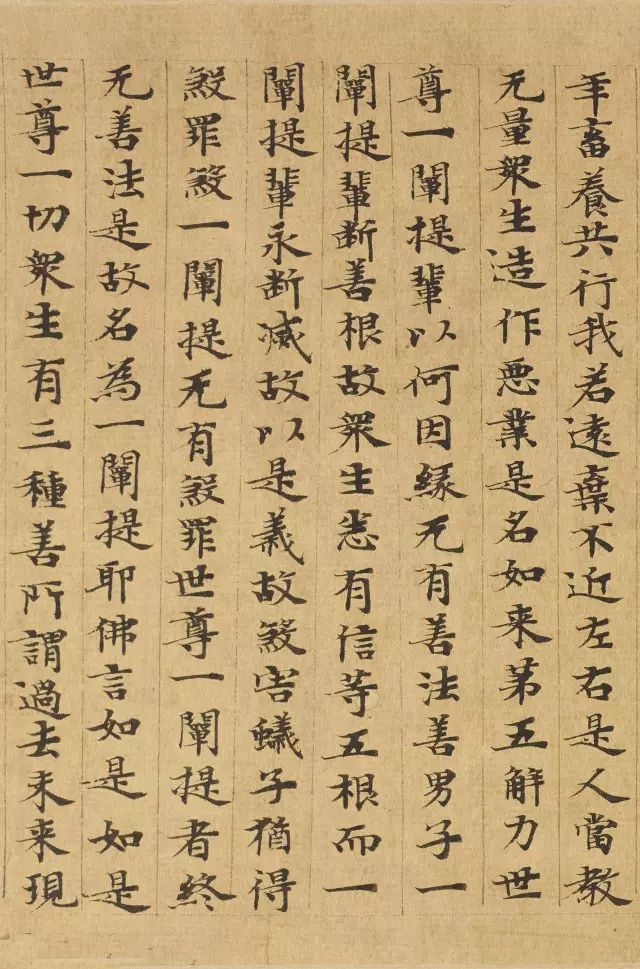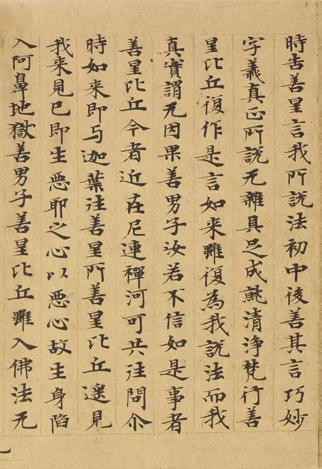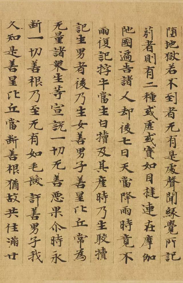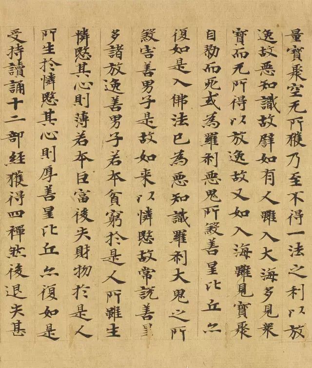 敦煌写经体,就是魏晋时期带有隶书、魏碑味道的楷书,这种写法一直延续了很长时间。为了看起来比较醒目易懂,一般佛经不用草书来写,而是用楷书工工整整地写。