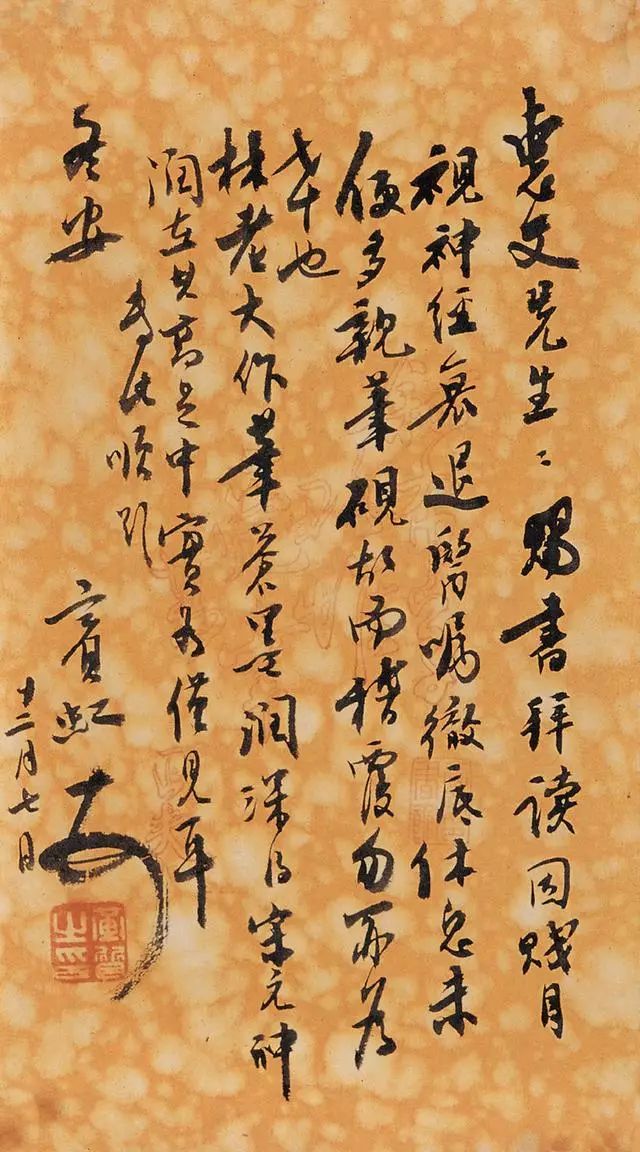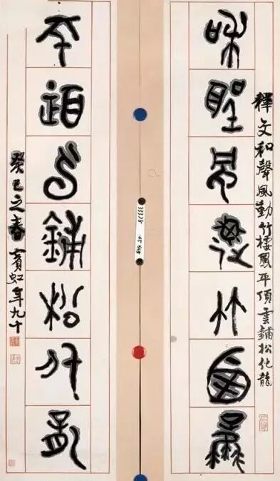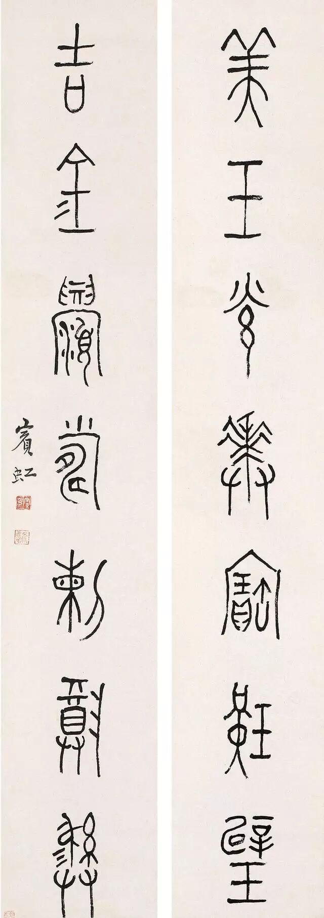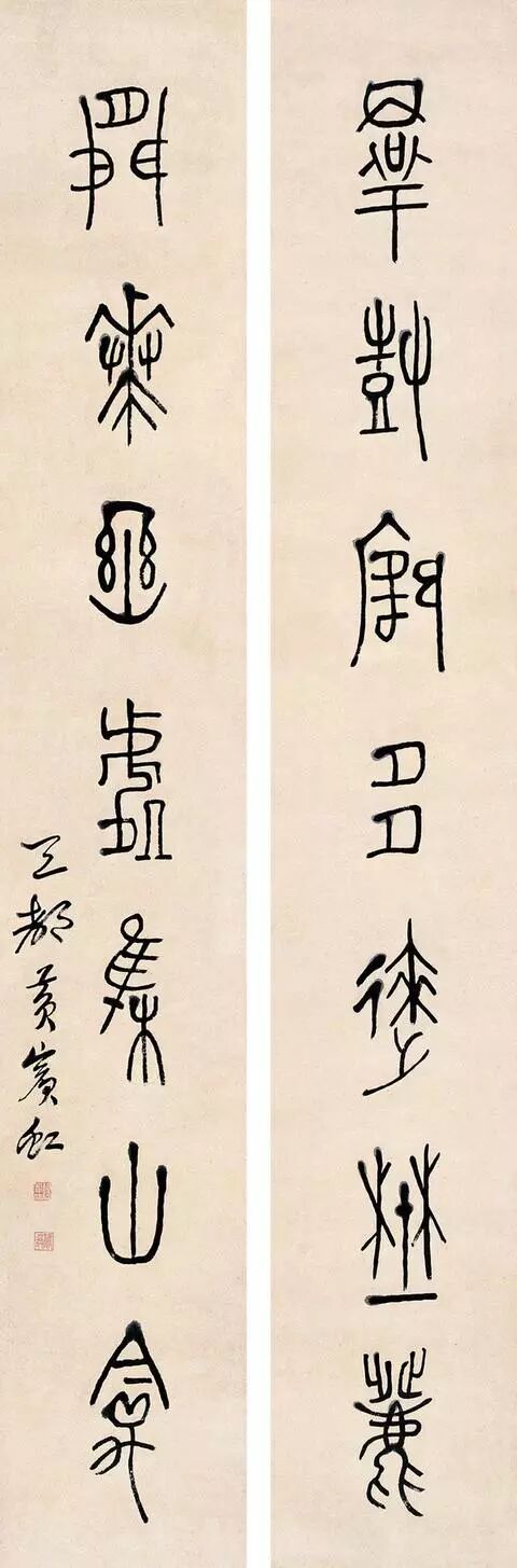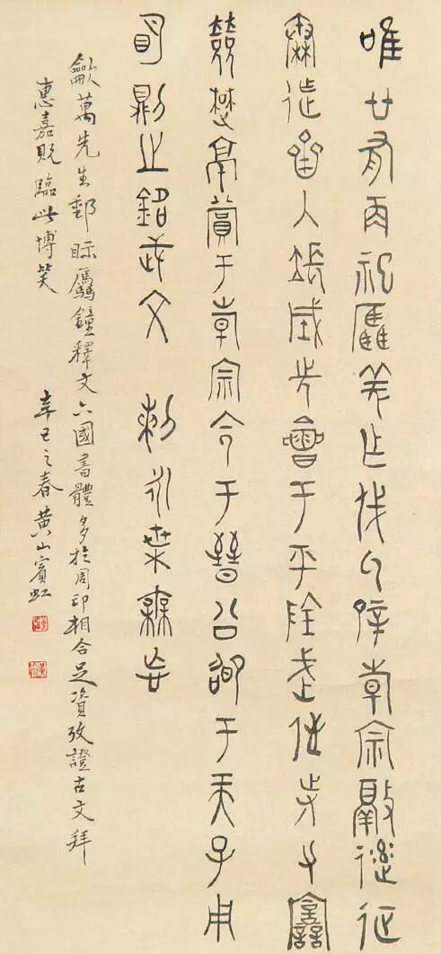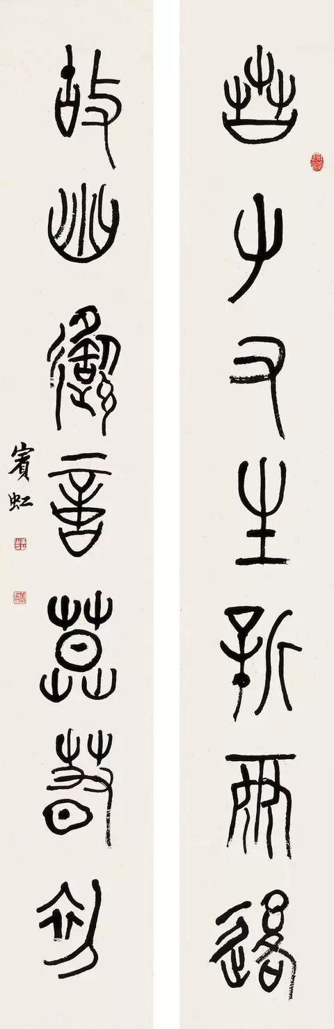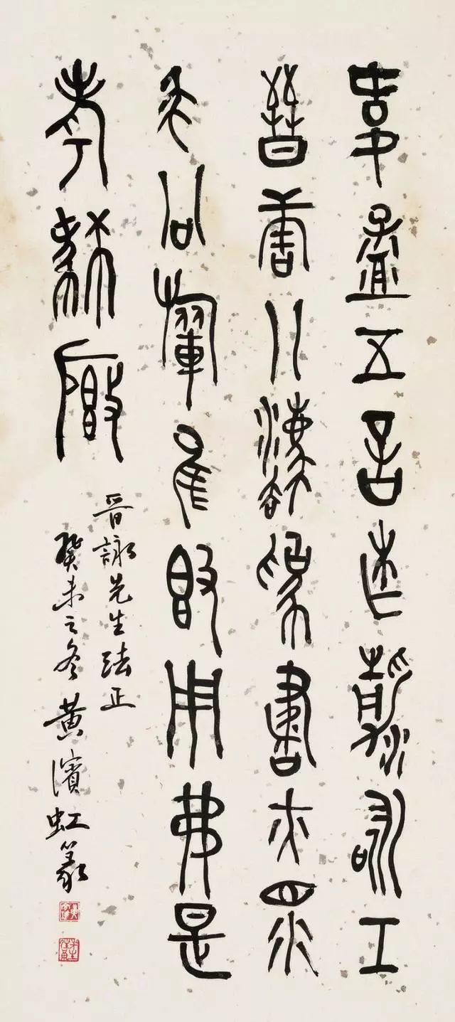 黄宾虹(1865 年1月27日--1955 年3月25日),原籍安徽省徽州(今黄山市)歙县,生于浙江金华,成长于老家歙县潭渡村,初名懋质,后改名质,字朴存,号宾虹,别署予向、虹叟、黄山山中人。近现代著名画家、书法家、学者。黄宾虹的书法取法于颜真卿行稿书的朴茂雄浑、倪云林行楷书的清动和雅,在三代古文气息的粘合下,独成一面貌,使其点画成为古来也不多见的“如屋漏痕”、“如绵裹铁”的高古之美。黄宾虹在甲骨文、金文上的成就,近代根本没人能比。黄宾虹在前人的基础上提出的“五笔七墨”,其中“五笔——平、圆、留、重、变”更是集大成者。在书法中,他绝不追求结字、用笔的“新理异态”,不像一些时书那样“矜毫使气”、“狂禅呵骂”,而是自然而然地“书”我的意趣、我的气质、我的神韵——实际上是外示“我”的自然美的观念。是如“灵运诗风”,优美、清刚、阴柔、洒脱、自然而质朴,是高华古艳而不是浓艳绩丽。给予者的审美余地,是空灵,是模糊,是丰富。黄宾虹书法主要是大篆和行书体,其文化涵是道家哲学思想的自然意识和生命意识的艺术显现。艺术创造的反“有为”,不仅没有使他的书法混灭个性和自我表现,相反却益增艺术品格的文化信息与审美魁力,似乎这也可旁证中国传统文化的精神正是如此?黄宾虹书法是古典型的商品位,其历史价值正体现在它本身就是凝固而鲜活的历史。它是用一种东方式的微笑瞻望着现代艺术表现的。
