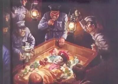 士兵们将碎椁木搬开,现出一具红漆滇金的内棺。匪官怕用刀斧劈砍损伤棺内宝物,严令匪兵小心谨慎地用刀撬开内棺。就在这时,突然,木棺中传出“喀嘣”声巨大响动,整个棺盖“哗”地蹦起一尺多高,紧接着,一阵凄冷冰凉的阴风黑雾“呼”地一声窜出棺外,直向兵士们的面部扑来,每个人的脸上都像被重重地击了一把石灰,痛疼难耐又涕泪俱下,眼前一片漆黑,头脑一阵晕眩。