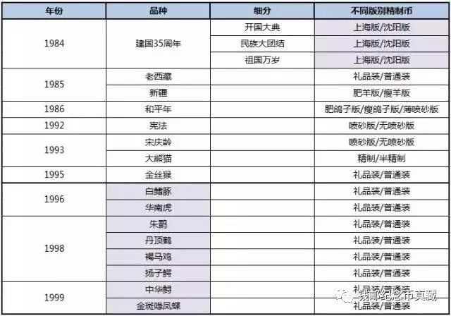 除了上表这些品种的纪念币有不同版别精制币,其他有对应精制币的品种,目前都仅发现了一款精制币。