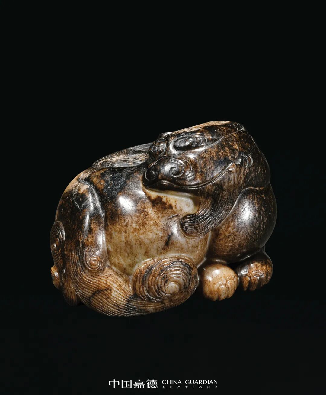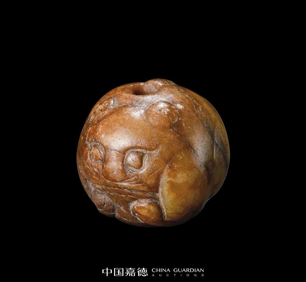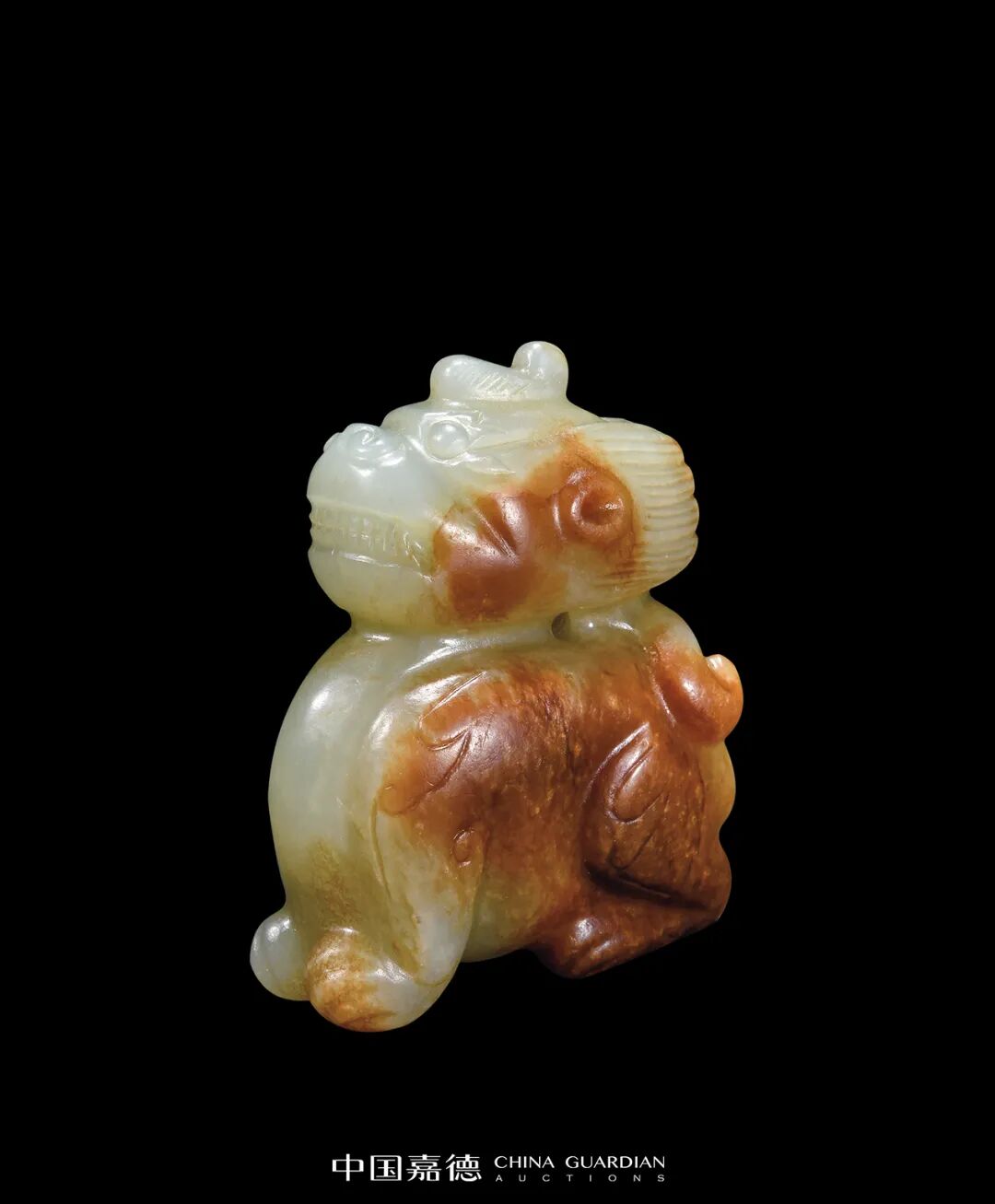 青白玉质,器表满布褐黄色沁,圆雕一伏卧兽,头部对钻圆孔,兽身无颈,身形浑圆,腹部肥硕,四肢收于腹下。整器器型敦厚,雕刻奇巧,以沁色为瑞兽皮色,手感温醇,宜于把玩。